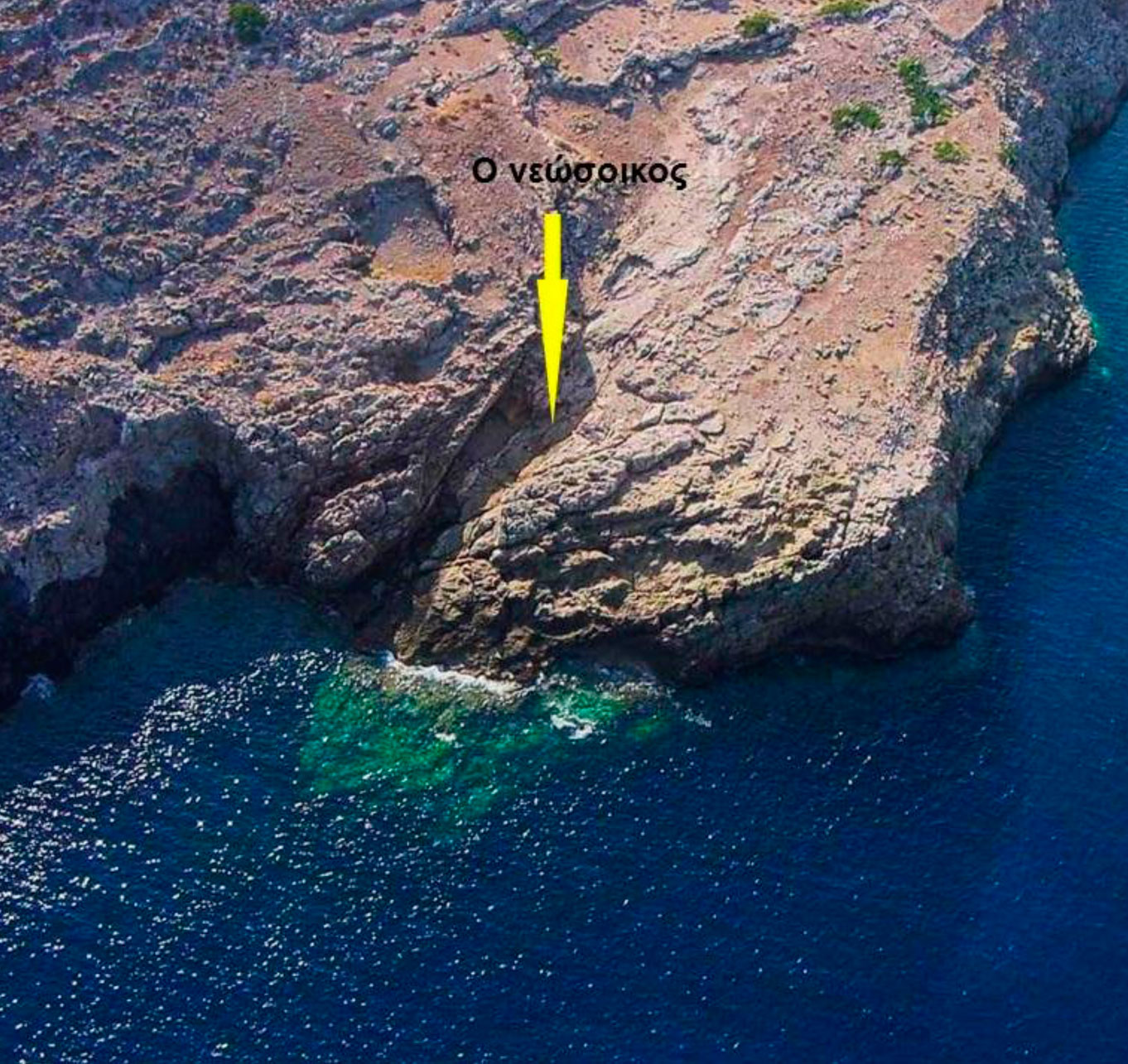 Ο νεώσοικος, μήκους περίπου 30 μ., είναι ορατός σήμερα σε όλο του το μήκος λόγω της ανύψωσης του νησιού που αναφέρθηκε πιο πάνω (εικ. 32, 33). Είναι σήμερα ορατά και τα τμήματα τα οποία είχαν λαξευτεί κάτω από την επιφάνεια της θάλασσας. Το ωφέλιμο μήκος του νεώσοικου, το τμήμα δηλαδή που θα φιλοξενούσε το πλοίο στη στεριά, είναι 18 μ. Στο βράχο σώζεται το αυλάκι στο οποίο θα τοποθετούσαν την ισχυρή θαλασσινή πύλη που θα δεχόταν μεγάλες πιέσεις από τους βόρειους ανέμους, οι οποίοι το χειμώνα χτυπούν το νησί με ιδιαιτέρως μεγάλη ένταση (εικ. 34).