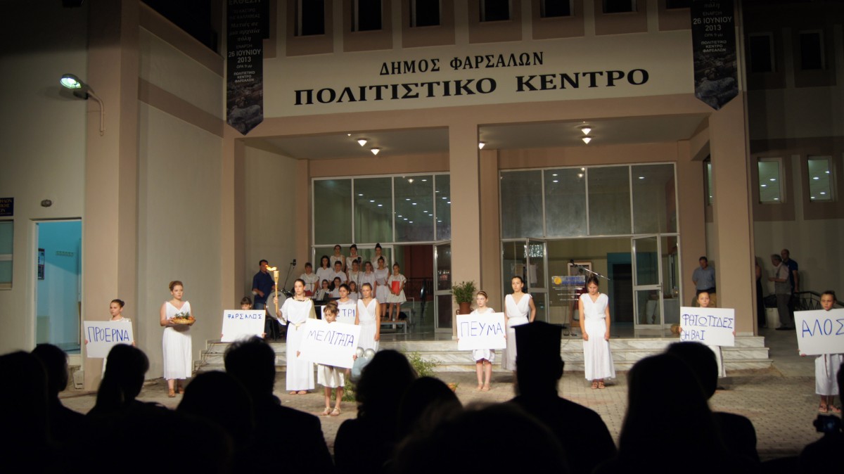 Στη συνέχεια, η διευθύντρια της Μουσικής Σχολής του Δήμου Φαρσάλων κ. Βίκυ Ιωάννου απηύθυνε ένα σύντομο χαιρετισμό και μαθητές της σχολής παρουσίασαν στιγμιότυπα της ζωής στο αρχαίο Κάστρο της Καλλιθέας, όπως έναν οργιαστικό χορό προς τιμήν του Πάνα και μια θυσία στη μεγάλη θεότητα, την Ενοδία.