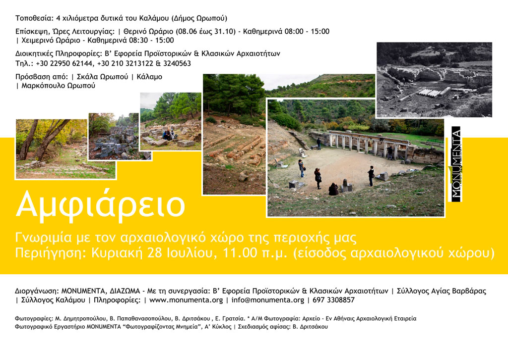 Για τρίτη συνεχή χρονιά η Monumenta και το Διάζωμα με τη συνεργασία της Β’ Εφορείας Προϊστορικών και Κλασικών Αρχαιοτήτων και των πολιτιστικών συλλόγων Αγίας Βαρβάρας και Καλάμου διοργανώνουν δωρεάν περιήγηση στο Αμφιάρειο, ένα από τα πιο σημαντικά αρχαία ιερά της Αττικής.