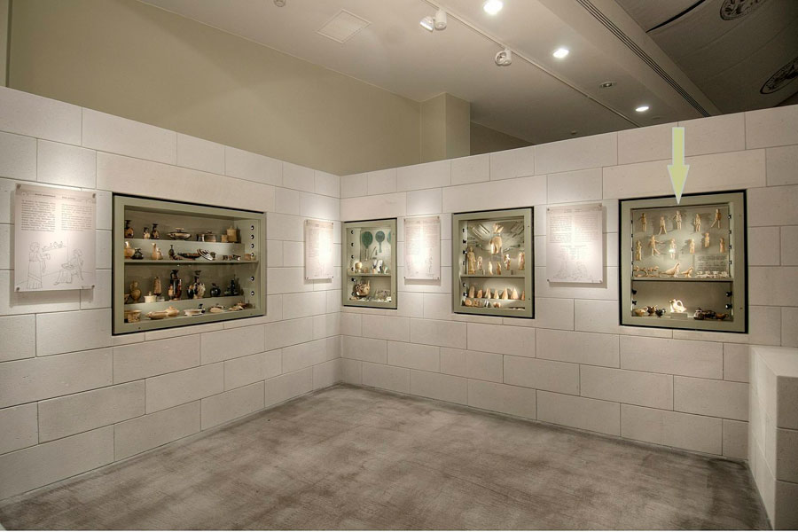 Οι επισκέπτες του Μουσείου Άρτας θα την εντοπίσουν στην αίθουσα Γ΄ του Μουσείου, και συγκεκριμένα στον «Γυναικωνίτη», όπου εκτίθενται ευρήματα που αναδεικνύουν τον πολυδιάστατο ρόλο της γυναίκας, όπως αγγεία καλλωπισμού, κοσμήματα, εξαρτήματα ενδυμάτων, καθώς και αντικείμενα που συνδέονται με τη ζωή των παιδιών.