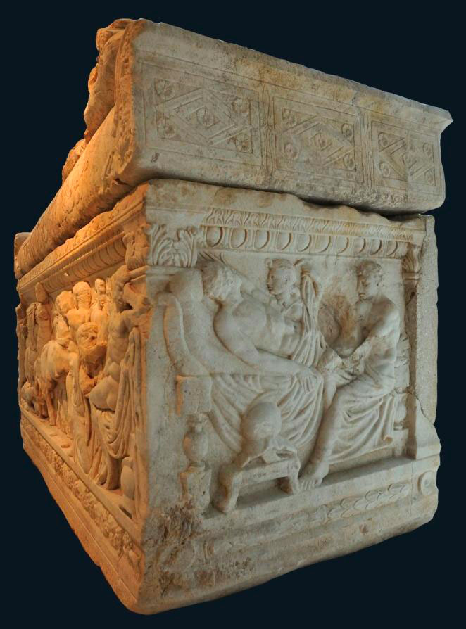 »Από τη σαρκοφάγο, λείπει η οπίσθια μακρά πλευρά και ο άνω κορμός του ζεύγους των νεκρών του καλύμματος. Το ζεύγος εικονίζεται ανακεκλιμμένο πάνω σε στρώμα, η μακριά όψη του οποίου είναι διακοσμημένη, σε χαμηλό ανάγλυφο, με θέματα από τον κόσμο των θαλασσίων θεοτήτων (Τρίτωνες, Νηρηίδες, έρωτες πάνω σε δελφίνια κ.ά.) σε τρεις μετόπες, ενώ οι πλαϊνές όψεις φέρουν ρομβοειδή κοσμήματα και ρόδακες.