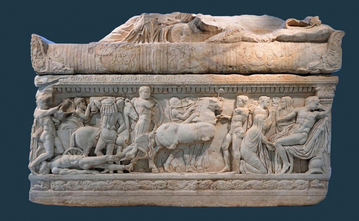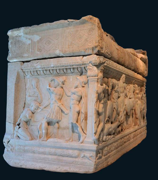 »Στην κύρια όψη του κελύφους εικονίζεται η σκηνή των λύτρων του Έκτορα, σκηνή που αναπαρίσταται με τον ίδιο τρόπο σε ομάδα σαρκοφάγων αποτελούμενη από σαρκοφάγο από την Ταρσό που εκτίθεται στα Άδανα, σαρκοφάγο από την Τύρο που εκτίθεται στο μουσείο της Βηρυτού και τη σαρκοφάγο του Μουσείου των Ιωαννίνων. Η απόδοση της του θέματος αναπαράγει τη σκηνή όπως περιγράφεται στη ραψωδία Ω της Ιλιάδας. Σύμφωνα με τον Όμηρο, οι θεοί αποφασίζουν να μεσολαβήσουν για τη λήξη της κακοποίησης του σώματος του νεκρού Έκτορα από τον Αχιλλέα, προκειμένου να αποκατασταθεί η ηθική και θρησκευτική τάξη. Με τη μεσολάβηση της Θέτιδας ο Αχιλλέας συναινεί στην επιστροφή του σώματος του Έκτορα με την καταβολή λύτρων. Ο Πρίαμος με τη βοήθεια του Ερμή φθάνει στο στρατόπεδο των Μυρμιδόνων και προσπέφτει ως ικέτης στα πόδια του Αχιλλέα.