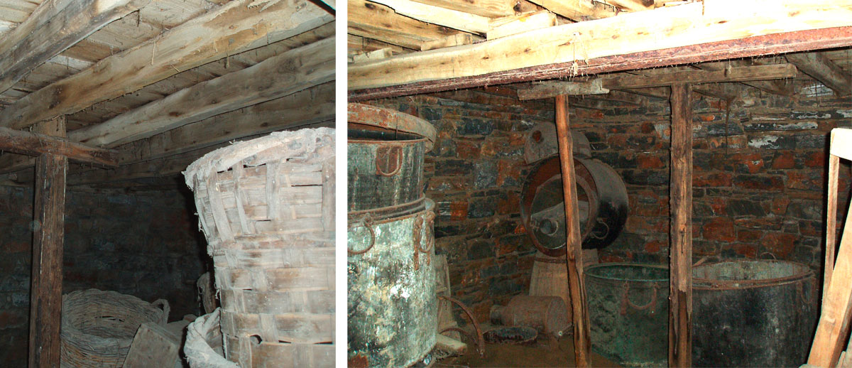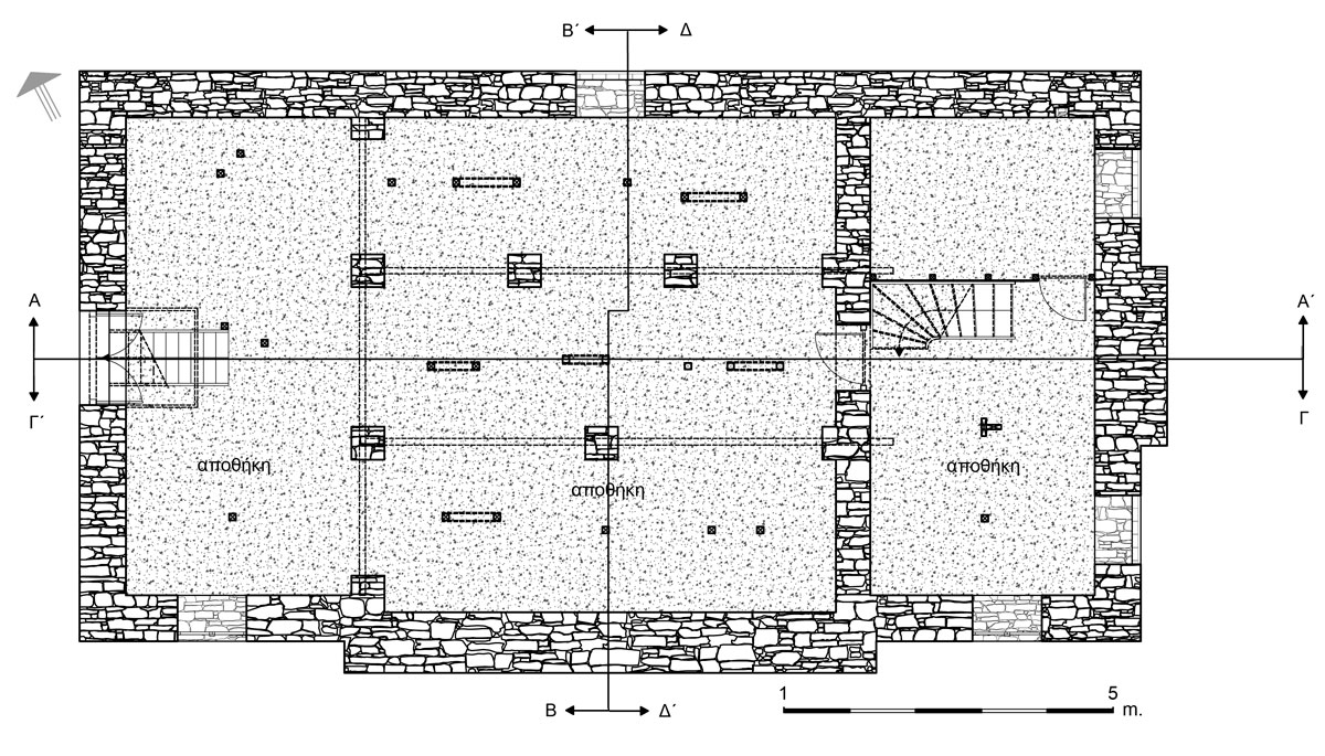 Η φέρουσα εσωτερική λιθοδομή κατά μήκος του άξονα Βορρά-Νότου χωρίζει το κτίσμα σε δύο διακριτά τμήματα: το ανατολικό και το δυτικό (εικ. 20).