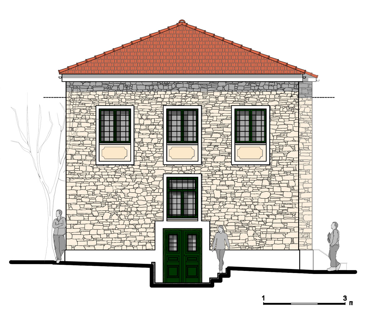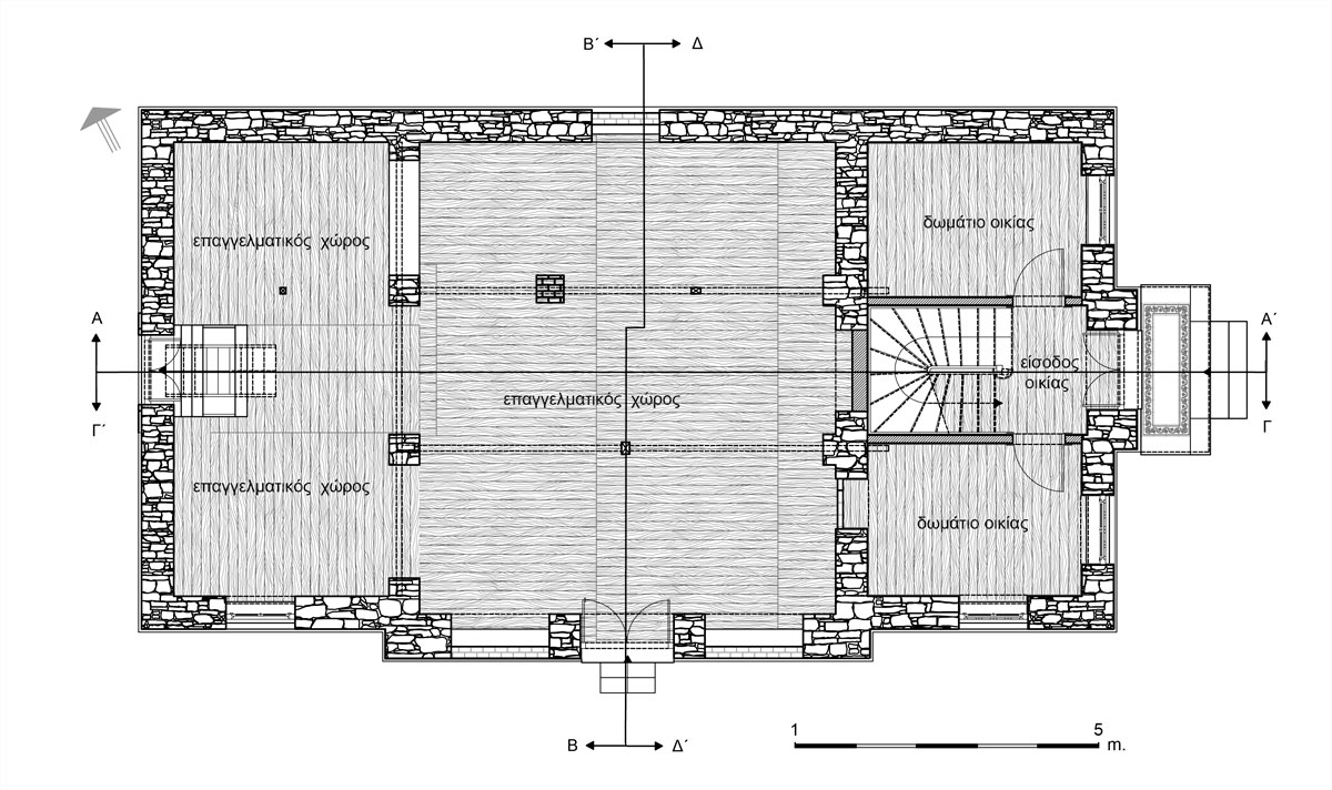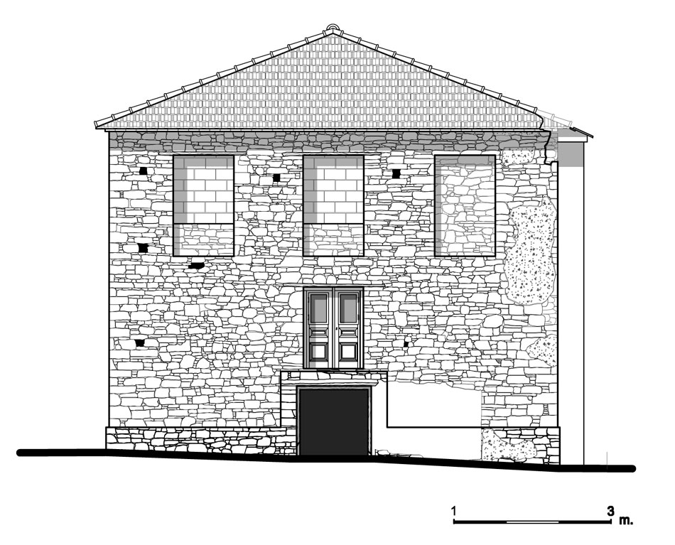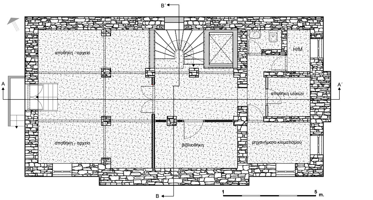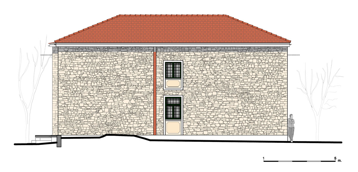 Eπειδή το κτίριο προορίζεται για δημόσια χρήση, επιβάλλεται η αύξηση του ύψους του ορόφου που σήμερα είναι 2,10 μ. ώστε το καθαρό του ύψος να γίνει 3,10 μ. Η αύξηση του ύψους του ορόφου θα γίνει με εμφανή λιθοδομή στην εξωτερική πλευρά της τοιχοποιΐας, με λίθους από περισυλλογή από τον οικίσκο [8] (εικ. 5) στο βόρειο άκρο της ιδιοκτησίας, που κατεδαφίστηκε.