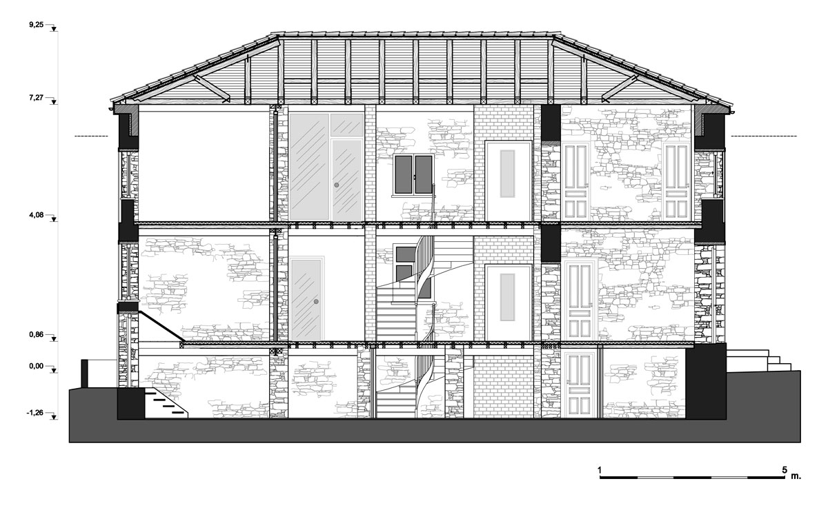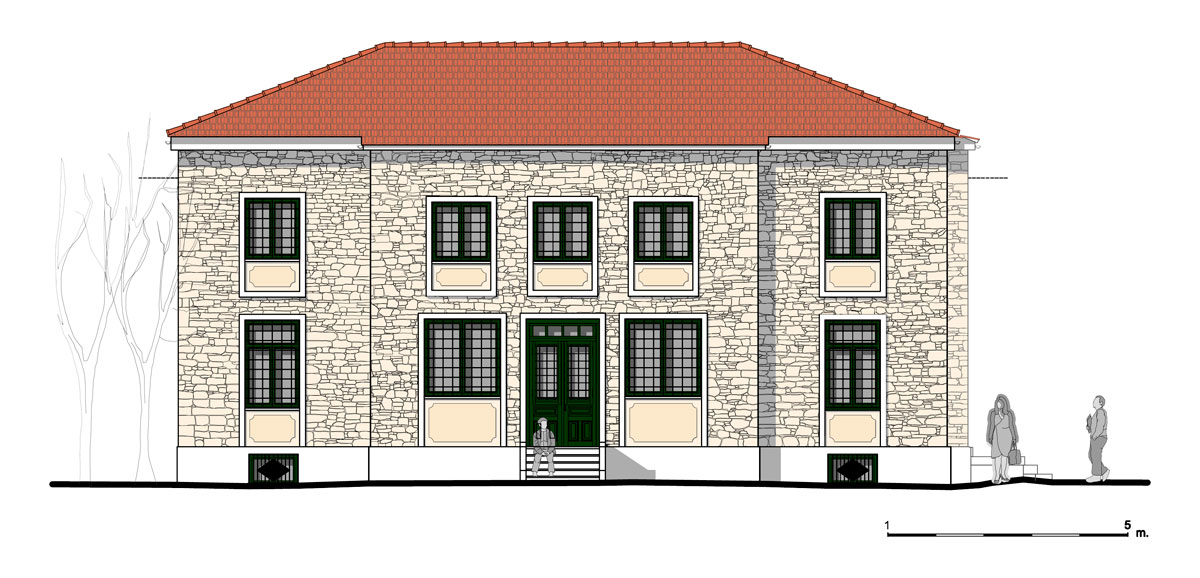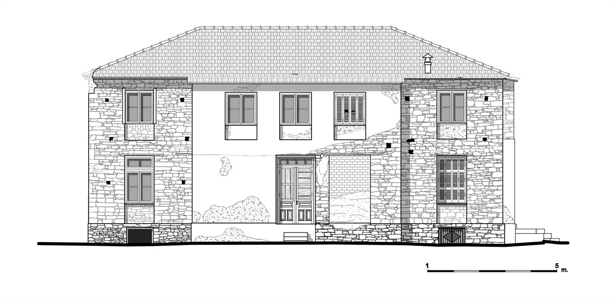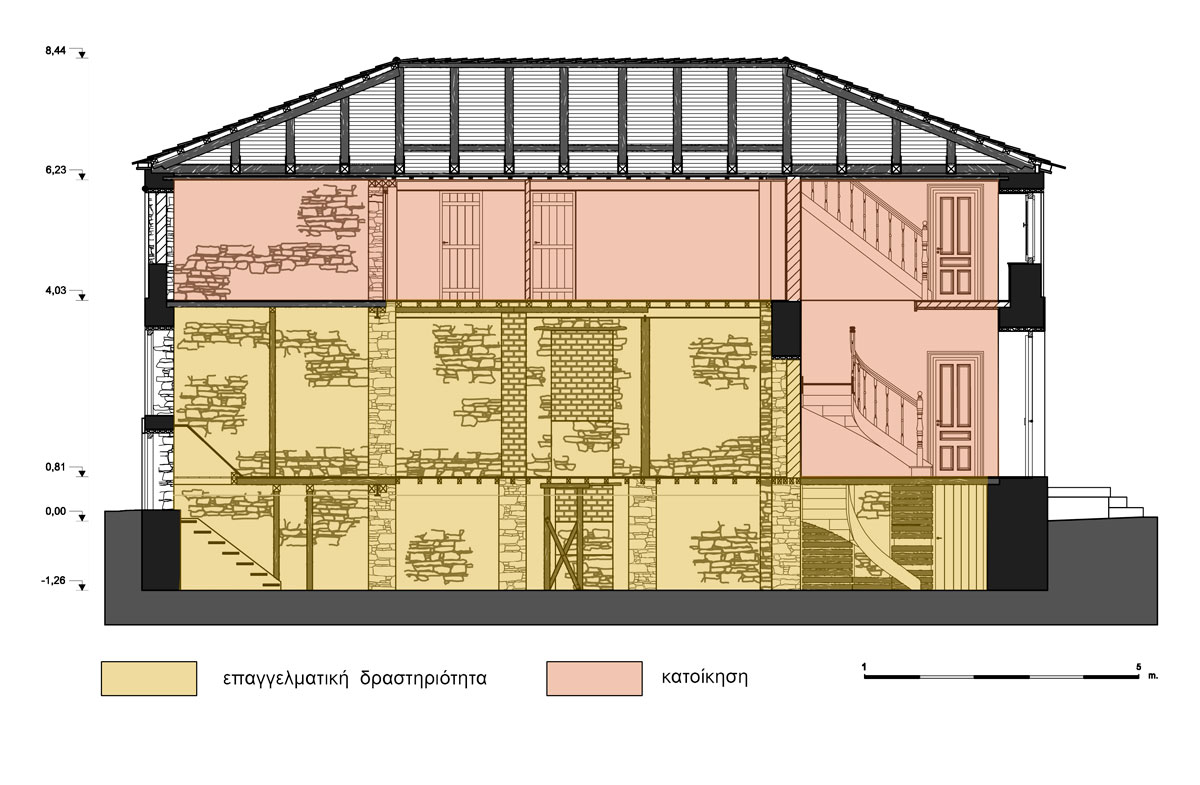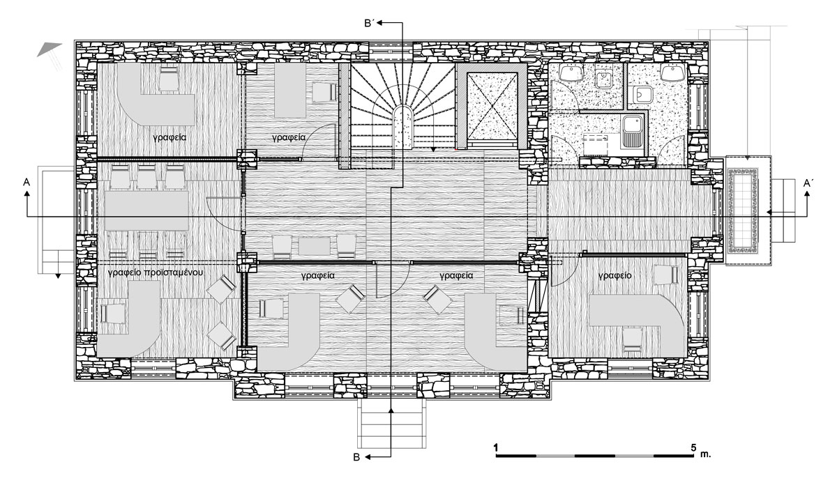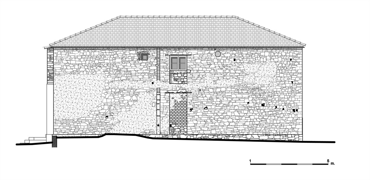Eπειδή το κτίριο προορίζεται για δημόσια χρήση, επιβάλλεται η αύξηση του ύψους του ορόφου που σήμερα είναι 2,10 μ. ώστε το καθαρό του ύψος να γίνει 3,10 μ. Η αύξηση του ύψους του ορόφου θα γίνει με εμφανή λιθοδομή στην εξωτερική πλευρά της τοιχοποιΐας, με λίθους από περισυλλογή από τον οικίσκο [8] (εικ. 5) στο βόρειο άκρο της ιδιοκτησίας, που κατεδαφίστηκε.