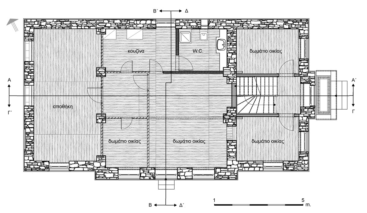 Τα πατώματα είναι ξύλινα με διαδοκίδες ανά 40 εκ. και τελικό δάπεδο τάβλες 15 εκ.