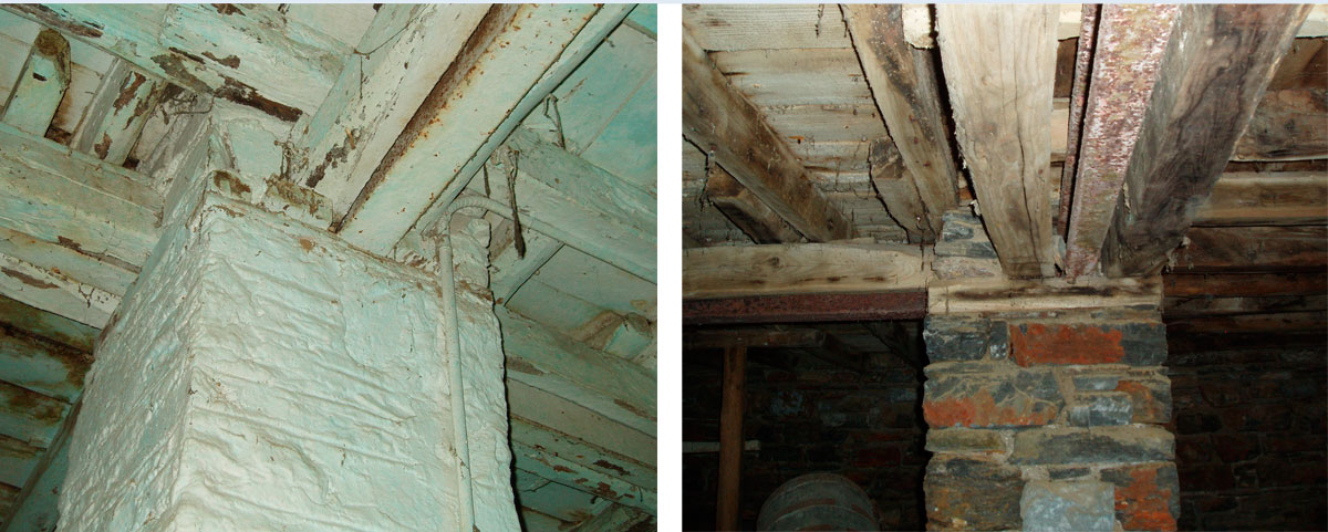 Σε όλους τους ορόφους στο εσωτερικό του κτιρίου, υπάρχουν δύο συμμετρικές σειρές λίθινων υποστηλωμάτων διαστάσεων 0,54×0,54 μ. πάνω στα οποία στηρίζονται δίδυμοι μεταλλικοί δοκοί ΙΡΕ 180 (εικ. 14) που φέρουν τα πατώματα του ισογείου και του ορόφου. Τα υποστηλώματα της ανατολικής σειράς συνδέονται με φέρουσα λιθοδομή. Στο επίπεδο του ημιυπόγειου, υπάρχουν τρία ακόμη λίθινα υποστηλώματα στο κεντρικό τμήμα της κάτοψης. Μεταγενέστερα, στο επίπεδο του ισογείου προστέθηκε ένα ακόμη υποστήλωμα από τούβλα διαστάσεων 0,45×0,45 μ., ενώ τόσο στο ημιυπόγειο όσο και στο ισόγειο τοποθετήθηκε ένας αριθμός πρόχειρων ξύλινων υποστηλωμάτων, προκειμένου να στερεωθούν καλύτερα οι ξύλινες δοκοί των πατωμάτων.