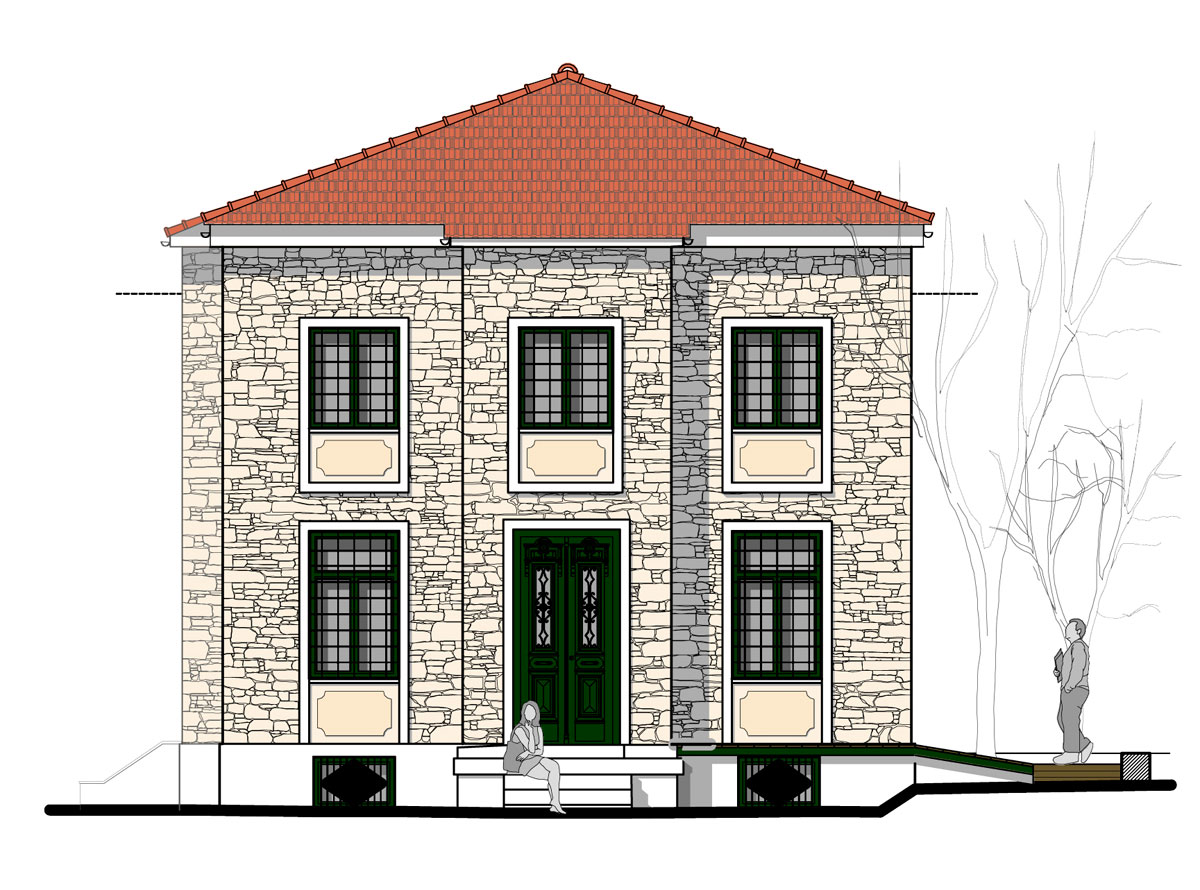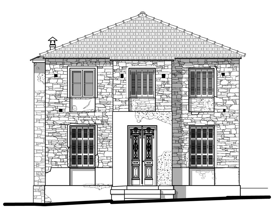 Στην εξωτερική τοιχοποιΐα (εικ. 25, 26, 27, 28) θα κυριαρχεί η εμφανής λιθοδομή με επιχρισμένα πλαίσια χρώματος γκρι ανοιχτού με τριφτό σοβά γύρω από τα κουφώματα και απλά διακοσμητικά στοιχεία κάτω από τα παράθυρα, στη μικρού βάθους εσοχή που δημιουργείται στη λιθοδομή κάτω από αυτά, στα πρότυπα κτίσματος της ίδιας εποχής και τεχνοτροπίας που βρίσκεται σε κοντινή απόσταση, αλλά και με βάση τα διατηρούμενα μορφολογικά στοιχεία του κτιρίου που παραπέμπουν σε αυτήν τη μορφή αποκατάστασης. Επίχρισμα θα υπάρχει και στη βάση του κτίσματος.