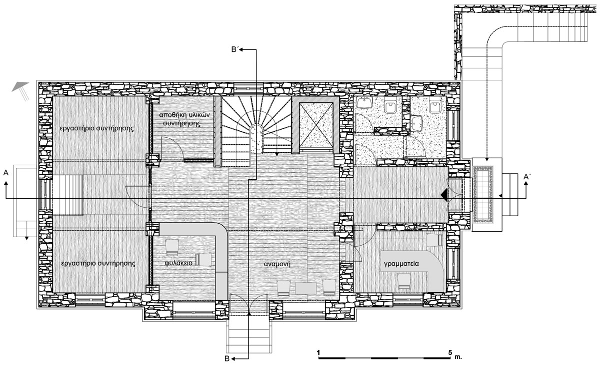 Τα λίθινα υποστηλώματα και η φέρουσα εσωτερική λιθοδομή θα διατηρηθούν. Η εσωτερική κλίμακα ανόδου που θα είναι ξύλινη και θα συνδέει το ημιυπόγειο και τους υπόλοιπους ορόφους, θα μετατοπιστεί από την αρχική της θέση και θα κατασκευαστεί στο κέντρο της βόρειας πλευράς του κτιρίου προκειμένου ο χώρος να καταστεί πιο λειτουργικός.