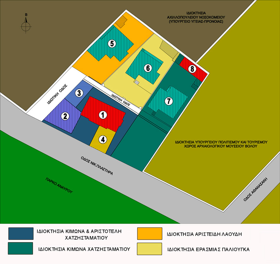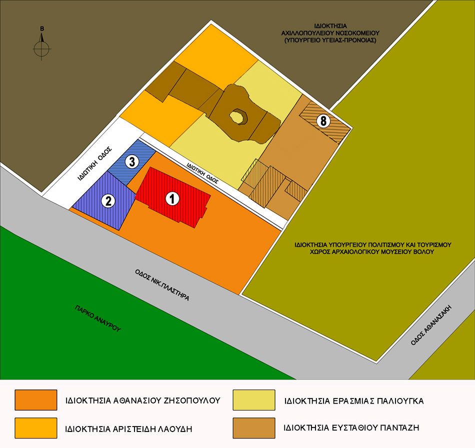 Η γειτνίαση των ιδιοκτησιών αυτών με τους δημόσιους χώρους του Μουσείου και του Νοσοκομείου, οι κτιριακές υποδομές των οποίων επεκτάθηκαν την τελευταία εικοσαετία, αλλά και της εκκλησίας της Αγίας Τριάδας (σημ. 25), o κίνδυνος ανέγερσης πολυώροφων οικοδομών και η αναγκαιότητα ύπαρξης ελεύθερων χώρων για μελλοντικές δραστηριότητες των δύο όμορων δημόσιων φορέων, είχαν ως αποτέλεσμα την αναγκαστική απαλλοτρίωση του συνόλου των ιδιοκτησιών, συνολικού εμβαδού 2.398,46 τ.μ., εξ ημισείας από το Υπουργείο Υγείας και Πρόνοιας (Αχιλλοπούλειο Νοσοκομείο Βόλου) και το Υπουργείο Πολιτισμού (ΙΓ΄ Εφορεία Προϊστορικών και Κλασικών Αρχαιοτήτων) το 2002 (σημ. 26) (εικ. 8). Η παράδοση-παραλαβή των ακινήτων που πέρασαν στην ιδιοκτησία του Υπουργείου Πολιτισμού έγινε στις 10 Απριλίου 2006, ενώ την ίδια χρονιά παρέλαβε τα ακίνητα που πέρασαν στην ιδιοκτησία του και το Υπουργείο Υγείας και Πρόνοιας.