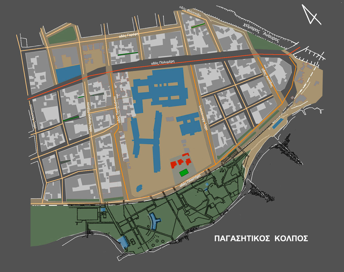 Η προκυμαία της νέας πόλης διαμορφώνεται σε ζώνη αναψυχής που εκτείνεται από το λιμάνι μέχρι το Αρχαιολογικό Μουσείο και τα θαλάσσια λουτρά του Αναύρου (σημ. 3). Ο μεγάλος όγκος των βιομηχανικών κτιρίων εγκαθίσταται γύρω από το λιμάνι και τον σιδηροδρομικό σταθμό, ενώ στο παραλιακό μέτωπο, στην περιοχή του Αγίου Κωνσταντίνου, κτίζεται το 1919 μόνο η αλευροβιομηχανία Καπουρνιώτη-Παντή (σημ. 4) στη θέση της αλευροβιομηχανίας Ζαρζάμπα-Ρήγα (1884) και σε μικρή απόσταση, επί της οδού Πολυμέρη, η πλακοποιΐα Μεφσούτ το 1920.