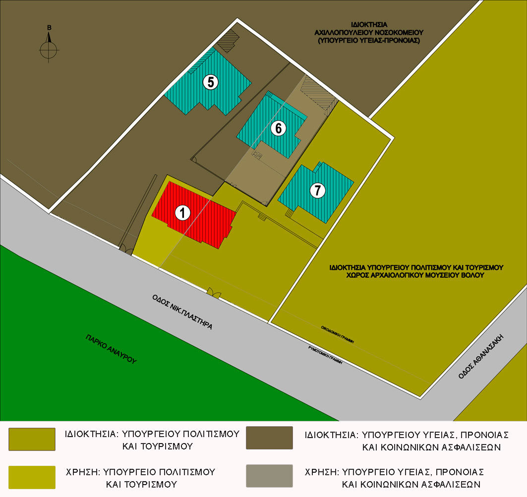 Προκειμένου να καταστεί δυνατόν τα δύο αυτά κτίρια να επαναχρησιμοποιηθούν, πρόκειται να γίνει πράξη πολυετούς αμοιβαίας παραχώρησης (εικ. 54), έτσι ώστε το μεν λιθόκτιστο κτίσμα [1] να χρησιμοποιηθεί ως κτίριο γραφείων της Αρχαιολογικής Υπηρεσίας, το δε ισόγειο κτίσμα [6] ως ξενώνας για τις ανάγκες του Νοσοκομείου Βόλου.