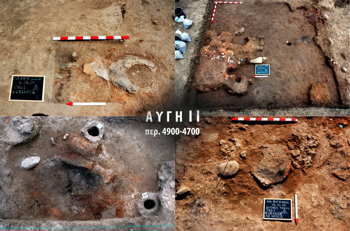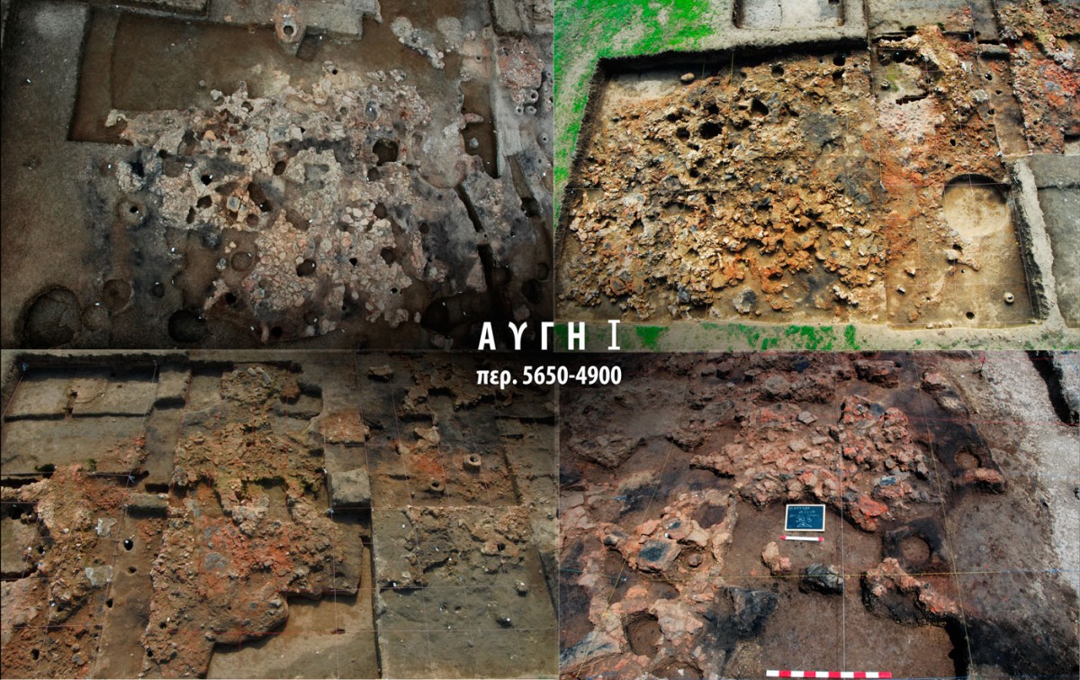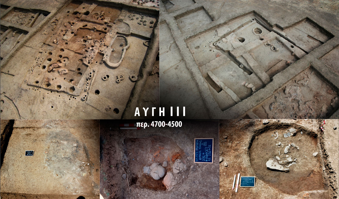 Η φάση ΑΥΓΗ Ι (~5650-5000/4900) χαρακτηρίζεται από την παρουσία εκτεταμένων καταλοίπων καμένων κτιρίων και μεγάλων ανοιχτών-κοινόχρηστων χώρων («αυλές»). Στις αρχές της 5ης χιλιετίας, στη φάση ΑΥΓΗ ΙΙ (~4900-4700), πάνω στα ερείπια της ΑΥΓΗΣ Ι, ο οικιστικός χώρος μοιάζει να αναδιοργανώθηκε, ίσως και να μετατοπίστηκε, και συμπεριέλαβε την ισχυρή συμβολική παρουσία ενός ταφικού χώρου καύσεων. Η ύστερη σωζόμενη φάση της θέσης, η ΑΥΓΗ ΙΙΙ (~4700-4500), αντικατοπτρίζει ένα νέο πρόγραμμα ενδοκοινοτικής οργάνωσης με μεγάλα κτίρια σε νέο, μάλλον ενιαίο ΒΔ-ΝΑ προσανατολισμό και παράλληλη διάταξή τους στον άξονα Δ-Α και σε διαδοχικά επίπεδα –σχεδόν αμφιθεατρικά– από Ν προς Β, οριοθέτηση του οικισμού, πιθανόν και επιμέρους κτιρίων, και επιπλέον στοιχεία δομημένης εναπόθεσης υλικών σε μια σειρά μικρών και μεγάλων λάκκων.