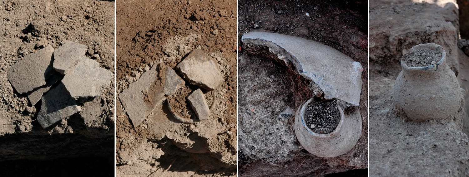 Στη φάση ΑΥΓΗ ΙΙ εντάσσονται, σύμφωνα με τα μέχρι τώρα στρωματογραφικά δεδομένα, και δέκα μικρά ταφικά αγγεία που εντοπίστηκαν σε ανοιχτή περιοχή στο κέντρο περίπου της θέσης (Στρατούλη κ.ά. 2009, Stratouli κ.ά. 2010). Τα ταφικά αγγεία βρέθηκαν τοποθετημένα σε ημικυκλική διάταξη, σε έκταση περίπου 3,0 τ.μ. (εικ. 11). Περιείχαν πολύ μικρές ποσότητες καμένων ανθρώπινων οστών, που συλλέχθηκαν και τοποθετήθηκαν μέσα στο αγγείο μετά την καύση της σωρού. Σύμφωνα με την οστεοαρχαιολογική ανάλυση (Σ. Τριανταφύλλου), ο εξαιρετικά υψηλός βαθμός αποσπασματικότητας των οστών, η έλλειψη χρωματικής διαφοροποίησής τους, η παρουσία χαρακτηριστικών ρωγμώσεων και παραμορφώσεων σε αυτά, και επιπλέον η απουσία στάχτης από το περιεχόμενο των ταφικών αγγείων οφείλονται στην επενέργεια υψηλών θερμοκρασιών, που είχαν ως αποτέλεσμα την τέλεια καύση των νεκρών. Μετά την ολοκλήρωση της καύσης, τα οστά παρέμεναν εκτεθειμένα για ικανό χρονικό διάστημα (ίσως και περισσότερο από 24 ώρες) προκειμένου να κρυώσουν και στη συνέχεια μια πολύ μικρή ποσότητα συλλέχθηκε και τοποθετήθηκε μέσα στο ταφικό αγγείο. Μάλιστα, η επιλογή των οστών, όπως μαρτυρεί η συνύπαρξη οστών από διαφορετικές σκελετικές κατηγορίες (κρανιακά και μακρά οστά), ήταν τυχαία. Σε δύο περιπτώσεις βρέθηκαν και καμένοι σπόροι μαζί με τα οστά του νεκρού. Σε επόμενο στάδιο, τα ταφικά αγγεία εναποτέθηκαν με το στόμιο προς τα πάνω στον επιλεγμένο χώρο του οικισμού και κάθε ένα καλύφτηκε με μία ή δύο στρώσεις από θραύσματα μεγαλύτερων αγγείων (εικ. 12), τα οποία πιθανώς, αφού χρησιμοποιήθηκαν, θραύστηκαν στα πλαίσια του τελετουργικού ταφής, σχηματίζοντας μικρούς τύμβους. Τα αγγεία εντοπίστηκαν μέσα στην ίδια επίχωση, αλλά σε διαφορετικά βάθη, και πιθανώς αντιστοιχούν σε διαφορετικά επεισόδια απόθεσης, κάτι που σημαίνει πως το συγκεκριμένο τελετουργικό ταφής επιβίωσε και εφαρμόστηκε στον συγκεκριμένο χώρο για ικανό χρονικό διάστημα.