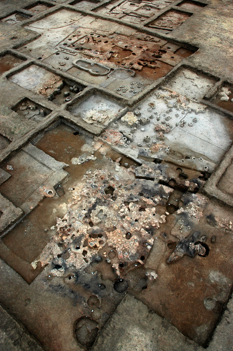 Μεταξύ των κτιρίων (εικ. 8) υπήρχαν μεγάλοι ανοιχτοί χώροι («αυλές») κοινωνικής διάδρασης (Στρατούλη κ.ά. 2012). Οι κοινόχρηστοι αυτοί χώροι περιλάμβαναν αρκετές θερμικές κατασκευές, ποικίλης μορφής και μεγέθους, όπως υπέργειους φούρνους, υπόσκαφα φουρνάκια με οπαίο και εστίες (βλ. Καλογηροπούλου 2011) καθώς και εργαλειακό εξοπλισμό, μεταξύ άλλων πολλά τριβεία και τριπτήρες (Bekiaris 2012) κοντά στις κατασκευές φωτιάς, που υποδεικνύουν –μεταξύ άλλων εργασιών– έντονη δραστηριότητα στη γειτνίαση των κτιρίων, και μάλιστα σε συνθήκες υψηλής ορατότητας, για την προετοιμασία τροφών και την παρασκευή του φαγητού.