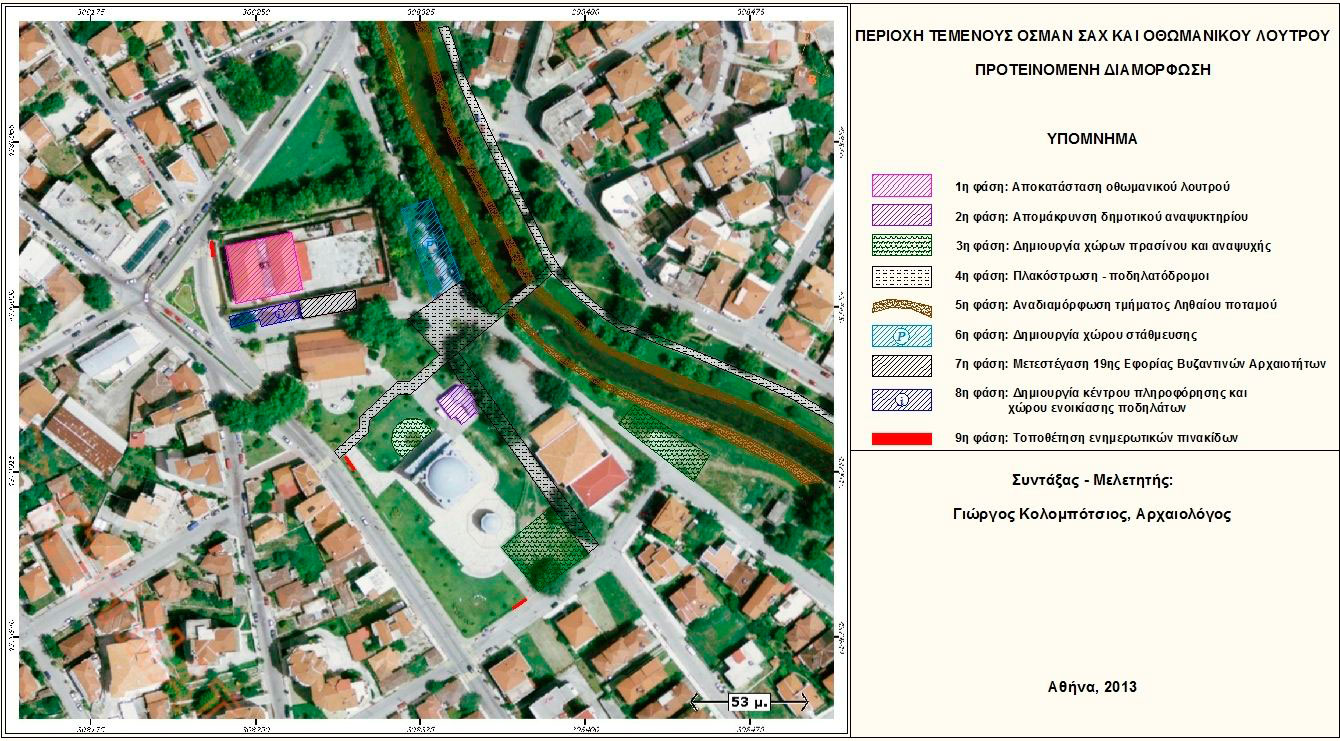 Σε ό,τι αφορά το παρακείμενο Οθωμανικό Λουτρό και με αφορμή την επικείμενη διαμόρφωση του ορόφου σε Κέντρο Έρευνας-Μουσείο Β. Τσιτσάνη, η αρμόδια 19η Εφορεία Βυζαντινών Αρχαιοτήτων εκπονεί μελέτη αποκατάστασης και ανάδειξης του Λουτρού, για την υλοποίηση της οποίας έχουν γίνει όλες οι απαραίτητες ενέργειες και συνεννοήσεις (προφορική ενημέρωση), ώστε να ενταχθεί σε πρόγραμμα χρηματοδότησης.