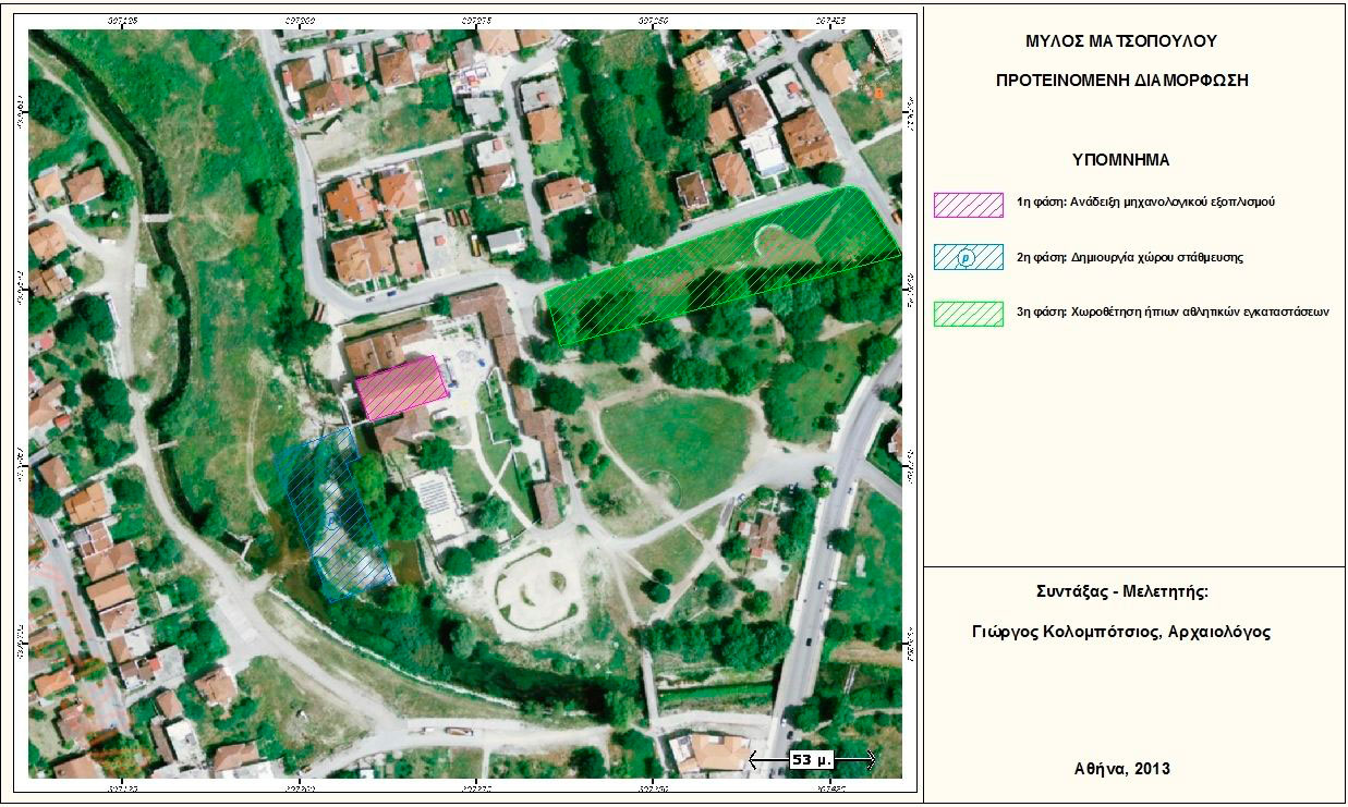 4. Μύλος Ματσόπουλου: Όπως προαναφέρθηκε, αναμένεται να ξεκινήσουν σύντομα οι εργασίες αποκατάστασης και ανάδειξης του μηχανολογικού εξοπλισμού του κεντρικού κτηρίου του Μύλου. Το έργο αυτό εντάσσεται στο γενικότερο πλαίσιο ανάπτυξης του Συγκροτήματος και της ευρύτερης περιοχής του ως πολιτιστικού πόλου έλξης επισκεπτών. Περιλαμβάνει τη μουσειακή ανάδειξη της κτηριακής υποδομής του Μύλου και του βιομηχανικού εξοπλισμού του, ο οποίος σώζεται ακέραιος κατά χώραν (in situ), καθώς και της διαδικασίας επεξεργασίας των σιτηρών στις αρχές του 20ού αιώνα.