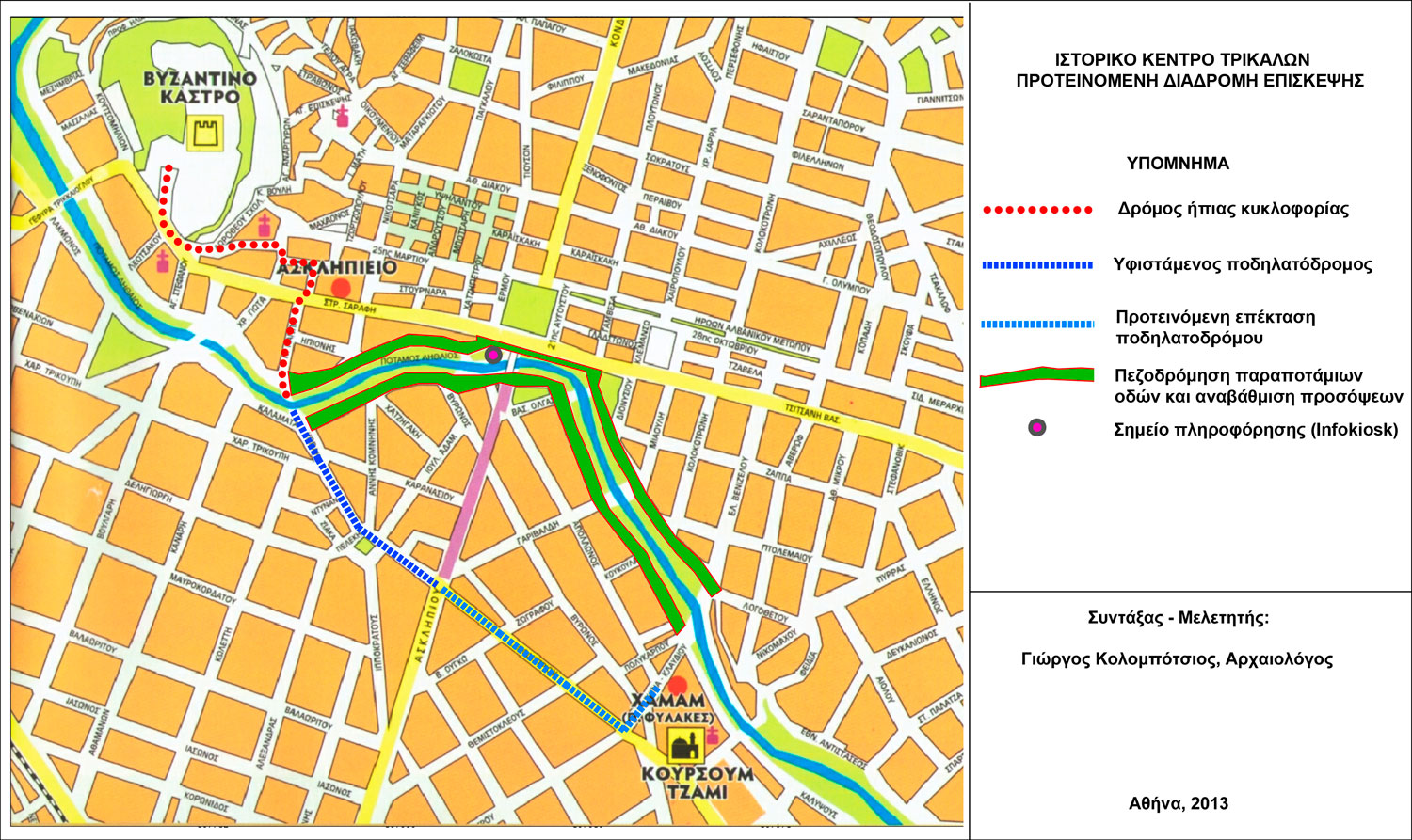 5. Κατευθυντήριες πινακίδες: Στην πόλη των Τρικάλων παρατηρείται παντελής έλλειψη κατευθυντήριων πινακίδων και πινακίδων σήμανσης των μνημείων. Για το λόγο αυτό επιβάλλεται να τοποθετηθούν σε κεντρικά σημεία της πόλης κατευθυντήριες πινακίδες για τους επισκέπτες. Για οικονομικούς και αισθητικούς λόγους, προκρίνεται η λύση της τοποθέτησης των πινακίδων στις τοιχοποιίες υφιστάμενων κτηρίων, σε ευδιάκριτα σημεία.