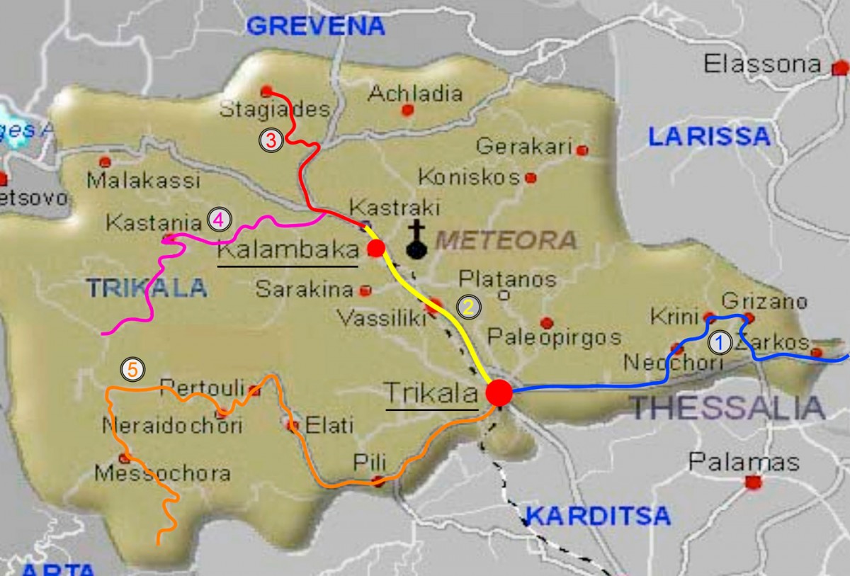 Διαδρομή 1 (Είσοδος από Λάρισα) Πελινναίον, πόλη Τρικάλων, Σπήλαιο Θεόπετρας, Καλαμπάκα – Μετέωρα, Χάσια (Κοίμηση Θεοτόκου Σταγιάδων)