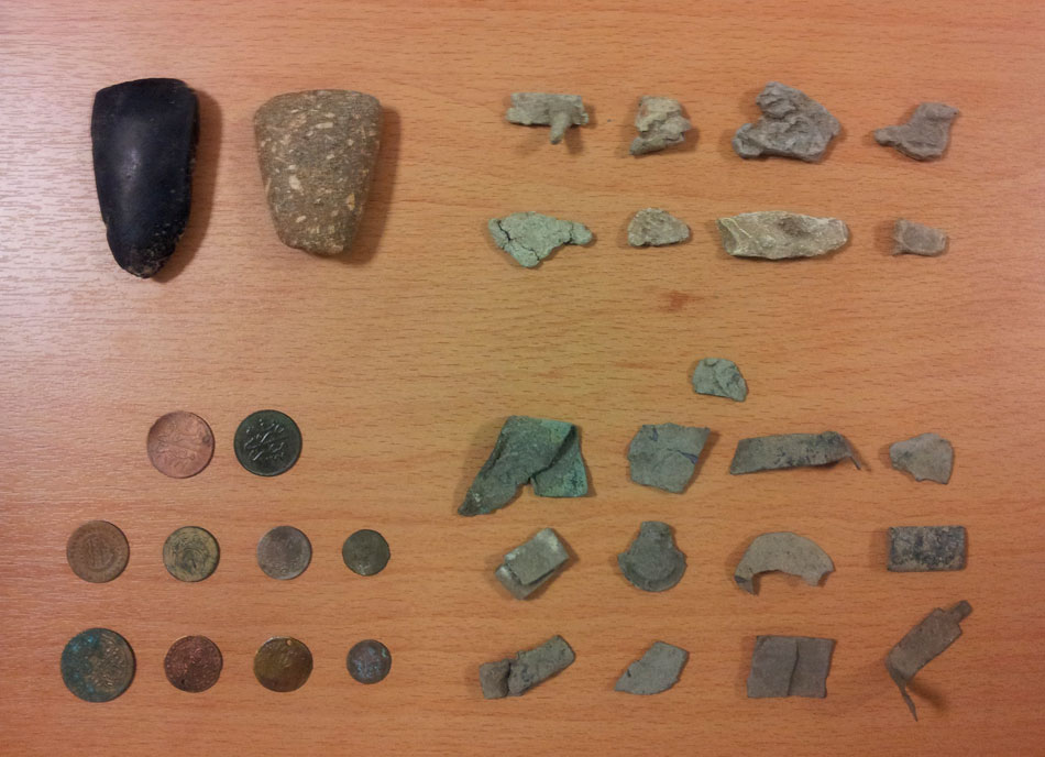 Συγκεκριμένα, σε έρευνα που πραγματοποίησαν αστυνομικοί της παραπάνω Υπηρεσίας, στην οικία όσο και σε επαγγελματική εγκατάσταση επεξεργασίας ξύλου του 50χρονου, βρέθηκαν και κατασχέθηκαν: δύο λίθινα εργαλεία προϊστορικών χρόνων (πέλεκεις), οκτώ υπολείμματα κατεργασμένου μολύβδου, οκτώ χάλκινα νομίσματα, εκ των οποίων τα επτά είναι οθωμανικά και το ένα μεσαιωνικό, και δεκατρία τμήματα από χάλκινα αδιάγνωστα αντικείμενα. Επιπλέον βρέθηκαν και κατασχέθηκαν διάφορες φωτογραφίες που απεικονίζουν αρχαία νομίσματα και διάφορες τοποθεσίες.