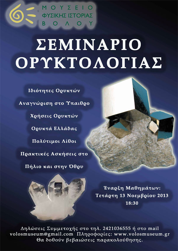 Σεμινάριο Ορυκτολογίας, το οποίο περιλαμβάνει δύο κύκλους, θεωρητικών μαθημάτων και πρακτικών ασκήσεων, διοργανώνει το Μουσείο Φυσικής Ιστορίας Βόλου, στο πλαίσιο των εκπαιδευτικών προγραμμάτων του. Οι συμμετέχοντες εισάγονται στην Ορυκτοδιαγνωστική, δηλαδή στις μεθόδους αναγνώρισης των ορυκτών, καθώς και στην περιγραφή των βασικών ορυκτών της Ελλάδας και της Μαγνησίας. Παρουσιάζονται οι κύριες χρήσεις των ορυκτών, ενώ γίνεται ειδική εισήγηση για τους πολύτιμους λίθους.
