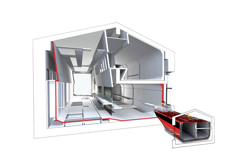Η έκθεση των μόνιμων συλλογών στο ισόγειο της «Καρράδειου» σχολής διαμορφώνεται με τη δημιουργία ενός εσωτερικού κελύφους, εμπνευσμένου από τα υλικά και την ανατομία του πλοίου. Εξάλλου, οι μορφές των κατασκευών και τα υλικά έχουν έμμεση αναφορά στα σιδερένια πλοία, αυτά με τα οποία αναπτύχθηκε η Καρδαμυλίτικη ναυτιλία.