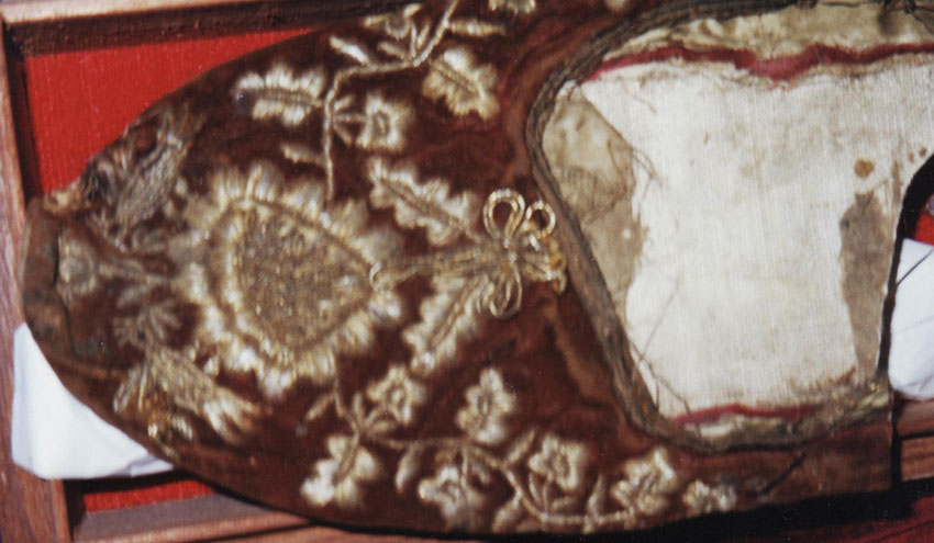 Οι μέγιστες διαστάσεις των εμβάδων είναι 25×12 εκ. Είναι κατασκευασμένες από κόκκινο κοφτό βελούδο επάνω στο οποίο κεντώνται με χρυσονήματα και μεταλλικά νήματα με μεταξένιο πυρήνα πάνω σε γέμισμα, ανθικά μοτίβα διακοσμημένα με τιρ-τιρ και πούλιες. Άλλες φορές οι εμβάδες κατασκευάζονται με λυγιστά και ίσια τιρ-τιρ (εικ. 2). Το εσωτερικό των εμβάδων είναι επενδεδυμένο με λευκή μεταξωτή φόδρα. Η σόλα της εμβάδας κατασκευάζεται από επενδεδυμένο χαρτόνι και όχι από δέρμα ή άλλα υλικά όπως παλαιότερα, έτσι ώστε η εφαρμογή στο σκήνωμα να είναι καλύτερη. Οι εμβάδες κατά την παράδοση κατασκευάζονται από τις μοναχές του Ιερού Ησυχαστηρίου Υπεραγίας Θεοτόκου Ελευθερώτριας στη Ζάκυνθο ή σε κατάστημα ιερατικών ειδών στην Αθήνα. Προφορική παράδοση παρουσιάζει ότι οι παλαιότερες εμβάδες (εικ. 3) ήταν κατασκευασμένες από ξύλινη και όχι από υφασμάτινη σόλα.