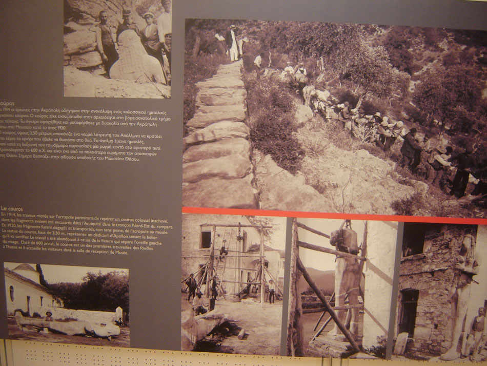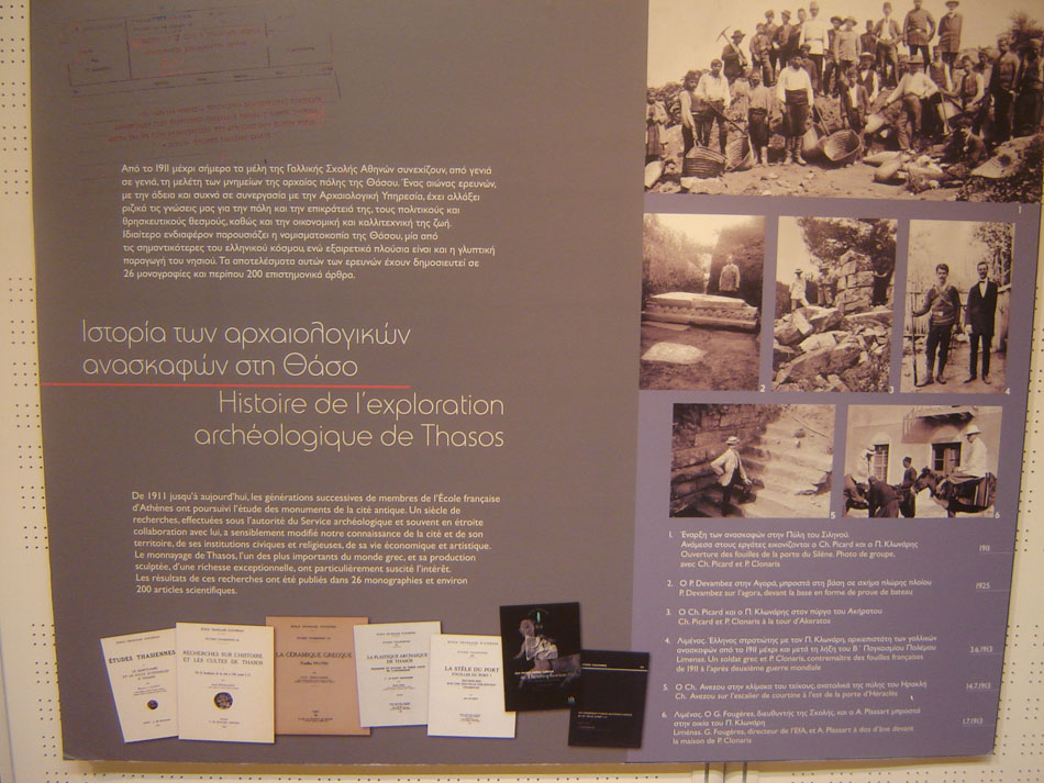 Η έκθεση, που περιλαμβάνει πλούσιο φωτογραφικό υλικό με σημαντικές πληροφορίες για την ιστορία των ανασκαφών στο νησί, πρωτοπαρουσιάστηκε στη Θάσο το 2011, οπότε συμπληρώθηκαν ακριβώς 100 χρόνια (1911), και μέχρι σήμερα περιόδευσε σε πολλές πόλεις κάνοντας ευρύτερα γνωστό το έργο που έχει επιτευχθεί τα τελευταία χρόνια.