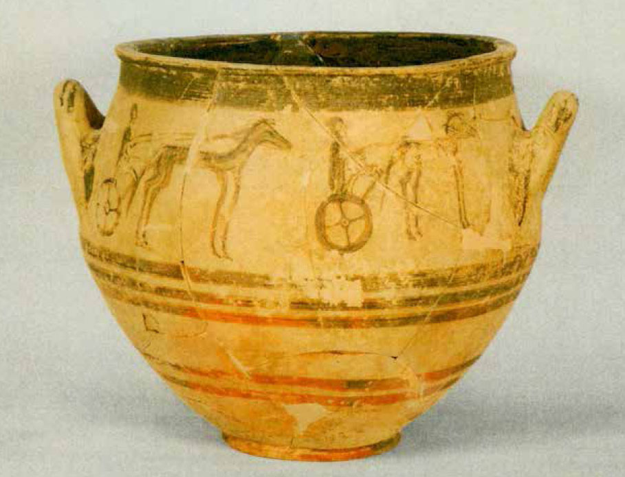 »Πολύ σημαντικό κεφάλαιο αποτελεί πλέον η ηλειακή εικονιστική κεραμική, που γνωρίζει ιδιαίτερη άνθηση κατά την ΥΕ ΙΙΙ Γ περίοδο. Αντιπροσωπεύεται από ανθρώπινες μορφές, πτηνά, ζώα, ψάρια, υβριδικά πτηνά, και βεβαίως από τα δύο κορυφαία έργα, την πρόθεση και την εκφορά νεκρού που διασώθηκαν πάνω σε όστρακα κρατήρα και αμφορέα αντίστοιχα, αλλά και τον κρατήρα της αρματοδρομίας, δημιουργώντας νέα δεδομένα για τον εικονιστικό ρυθμό στη δυτική Ελλάδα.