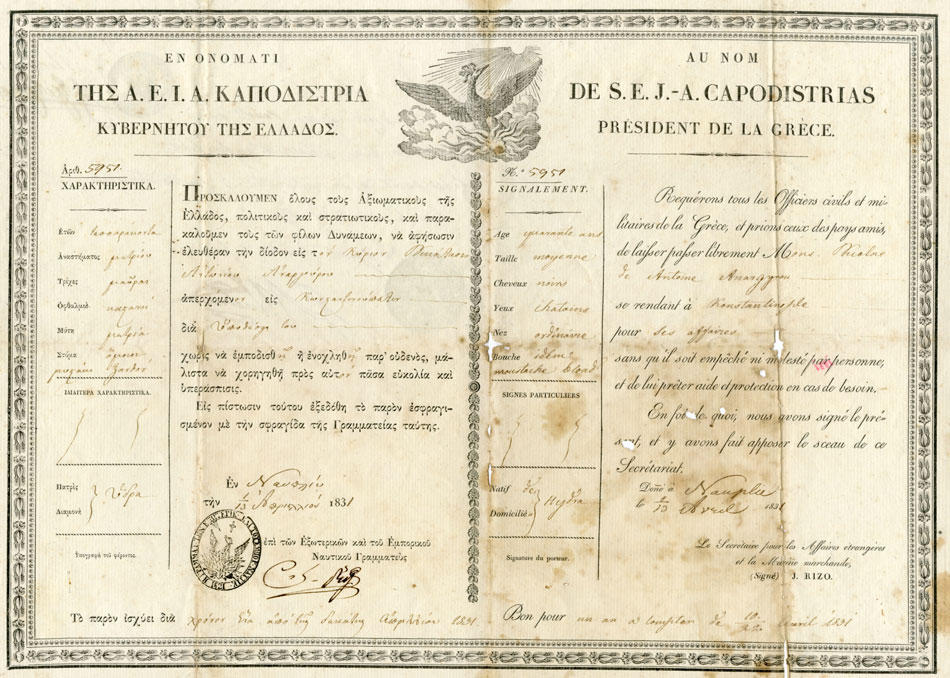Τα εκθέματα χρονολογούνται από τον πρώτο χρόνο της Ελληνικής Επανάστασης, μέχρι την περίοδο της Δικτατορίας. Το παλαιότερο από αυτά είναι ένα διαβατήριο του 1821 για τον Αργύριο Δημητρίου Ταρποχτζή, προκειμένου να ταξιδέψει στην Αλεξάνδρεια, υπογεγραμμένο από τον Άγγλο πρόξενο στη Θεσσαλονίκη και σφραγισμένο από το ιταλικό προξενείο της Αιγύπτου. Προξενεία της Βρετανίας υπήρχαν εκείνη την εποχή στον ελλαδικό χώρο της Οθωμανικής αυτοκρατορίας για να εξυπηρετούν τα βρετανικά εμπορικά συμφέροντα. Η Θεσσαλονίκη ως σημαντικό εμπορικό κέντρο της εποχής προσέλκυσε το ενδιαφέρον του γαλλικού και αγγλικού εμπορίου από τον 18ο αιώνα και μετά.