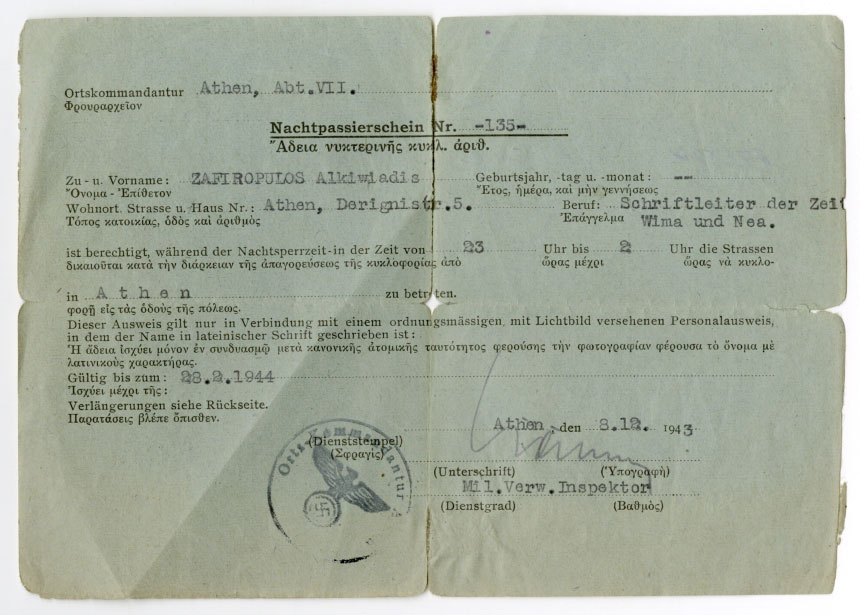 Ιδιαίτερη σημασία έχουν οι άδειες και τα πάσα, με τα οποία επιτρεπόταν το ταξίδι μέσα στα όρια της ελληνικής επικράτειας σε κρίσιμες περιόδους, όπως ο Α΄ Παγκόσμιος πόλεμος και η Κατοχή. Χαρακτηριστικό παράδειγμα αποτελεί πάσο της Κατοχής που εκδόθηκε από το γερμανικό φρουραρχείο στην Αθήνα για τον διευθυντή της εφημερίδας «Αθηναϊκά Νέα», Αλκιβιάδη Ζαφειρόπουλο, προκειμένου να έχει τη δυνατότητα της νυχτερινής κυκλοφορίας στην ελληνική πρωτεύουσα.