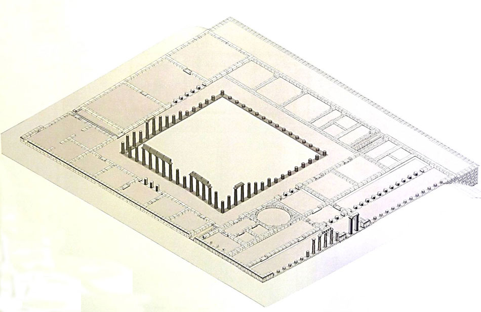 Στα ανατολικά, στην πρόσοψη, βρίσκονταν δύο εντυπωσιακές στοές, οι πρώτες πλήρως ανεπτυγμένες διώροφες στοές της ελληνικής αρχιτεκτονικής, που περιλάμβαναν θρανία για τουλάχιστον 120 καθισμένους. Εκεί ήταν και η μνημειώδης είσοδος του πρόπυλου, από την οποία περνούσαν οι 3.500 και πλέον επίλεκτοι Μακεδόνες για να κατευθυνθούν στο περιστύλιο, την καρδιά του κτιρίου, που λειτουργούσε ως Αγορά. Στα παραπάνω σημεία –και όπου αλλού είναι εφικτό– θα επιχειρηθεί η αποκατάσταση στο μάξιμουμ, με βάση το αρχαίο, αλλά και το νέο υλικό, που είναι απαραίτητο για τη διάσωση του αυθεντικού. Όσο για το έργο της αντιστήριξης του βόρειου πρανούς, το θέμα θα επανέλθει όταν διερευνηθεί περαιτέρω από τους μελετητές.