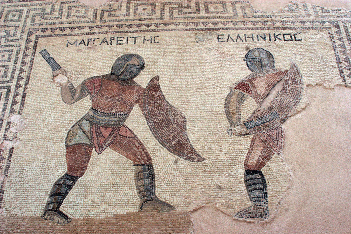 – Η Οικία των Μονομάχων: ρωμαϊκή οικία, που χρονολογείται στον 3ο αι. μ.Χ. και βρίσκεται λίγα μέτρα ανατολικά από την «Οικία του Αχιλλέα». Η οικία αυτή έχει μια κεντρική αυλή που περιβάλλεται από στοές και δωμάτια διαφόρων χρήσεων. Το κτίριο αυτό καταστράφηκε από τους σεισμούς που έπληξαν το Κούριο κατά τον 4ο αι. μ.Χ. Η οικία πήρε το όνομά της από τις ψηφιδωτές παραστάσεις μονομάχων που κοσμούσαν την κεντρική αυλή. Σήμερα σώζονται δύο παραστάσεις. Η πρώτη απεικονίζει εξάσκηση μονομάχων, ενώ η δεύτερη φαίνεται ότι απεικονίζει αγώνα. Η άοπλη μορφή με την πλούσια πολιτική περιβολή που εικονίζεται στο κέντρο είναι ο διαιτητής της μονομαχίας. Ιδιαίτερο ενδιαφέρον παρουσιάζει το γεγονός ότι και στις δύο παραστάσεις σώζονται τα ονόματα των πρωταγωνιστών.