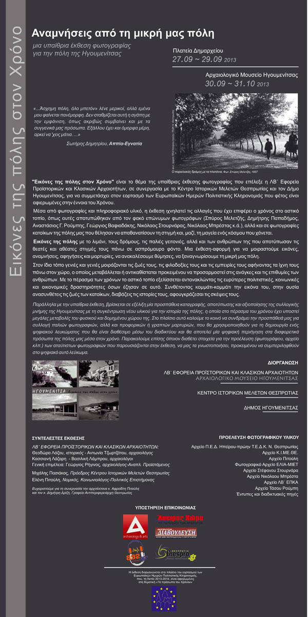 Συμμετέχοντας στον εορτασμό για τις Ευρωπαϊκές Ημέρες Πολιτιστικής Κληρονομιάς, τον Σεπτέμβριο εγκαινιάστηκε η υπαίθρια έκθεση φωτογραφίας «Εικόνες της πόλης στον Χρόνο». Μέσα από το φακό επώνυμων φωτογράφων, αλλά και αναμνηστικές φωτογραφίες κατοίκων της πόλης η έκθεση ιχνηλάτησε τις αλλαγές που έχει επιφέρει ο χρόνος στο αστικό τοπίο της Ηγουμενίτσας και ταυτόχρονα ανέδειξε τη μαγεία ενός κόσμου που έχει πλέον χαθεί. Η έκθεση αυτή είχε ιδιαίτερα μεγάλη επιτυχία, καθώς μόνο το τριήμερο του εορτασμού (27-29 Σεπτεμβρίου) την επισκέφθηκαν περισσότερα από 1.500 άτομα. Η έκθεση στη συνέχεια μεταφέρθηκε στο Αρχαιολογικό Μουσείο Ηγουμενίτσας όπου και προβλέπεται να παραμείνει για το επόμενο διάστημα.