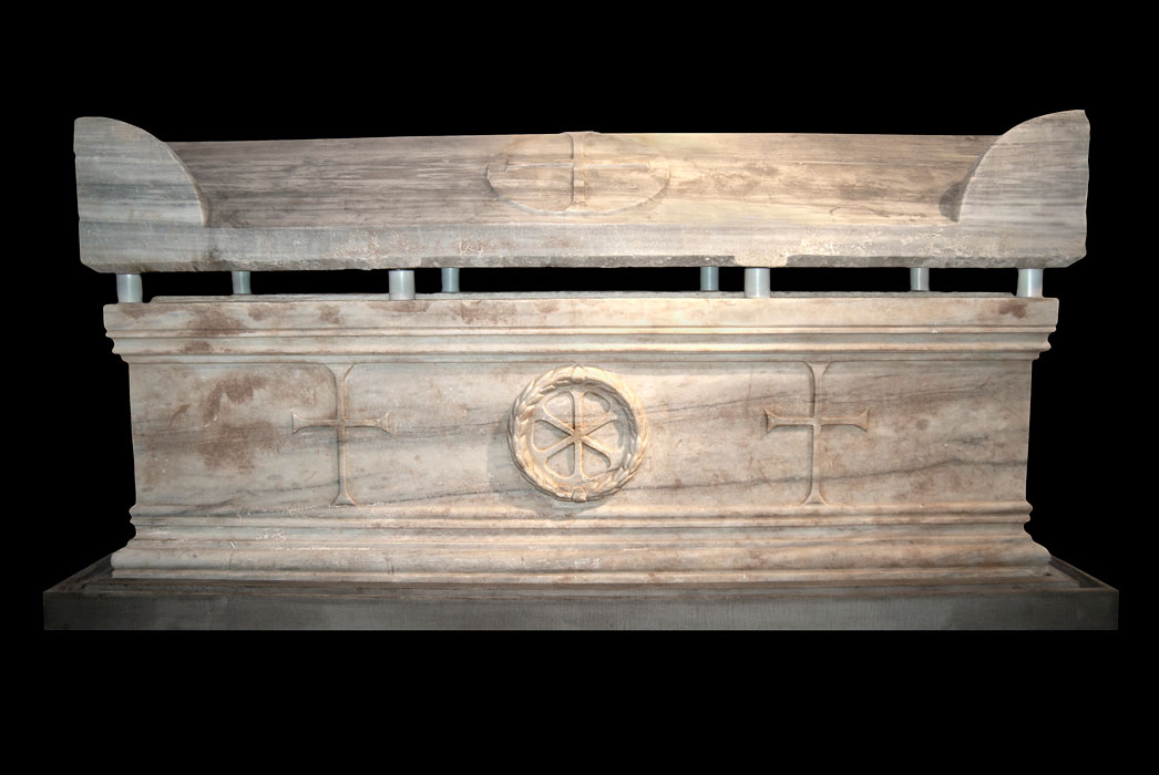 »Η σαρκοφάγος σώζει ακέραιη τη λάρνακα και το κάλυμμά της. Η λάρνακα φέρει στις μακρές πλευρές της από ένα ανάγλυφο κυκλικό, δάφνινο στεφάνι που περικλείει Χριστόγραμμα και πλαισιώνεται από δυο ανάγλυφους ανισοσκελείς σταυρούς με πεπλατυσμένες κεραίες. Ομοίου τύπου σταυροί κοσμούν και τις στενές πλευρές της λάρνακας. Το θέμα του στεφάνου από φύλλα δάφνης που περικλείει σταυρό ή μονόγραμμα συμβολίζει τη νίκη κατά του θανάτου.