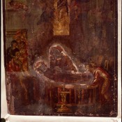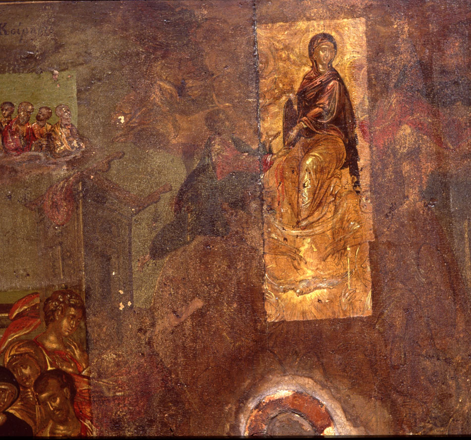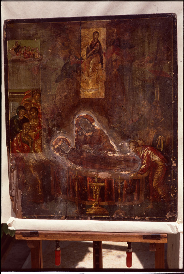 Περισσότερο σύνθετη και εντελώς ευαίσθητη είναι η τεχνική των εικόνων του β΄ μισού του 16ου αιώνα όπου δοκιμάζονται αναμίξεις υλικών, ίσως λαδιού, με επιδράσεις από τη ζωγραφική της Βενετίας. Από τα πιο αντιπροσωπευτικά παραδείγματα η εικόνα της «Κοίμησης της Θεοτόκου» του Θεοτοκόπουλου (εικ. 2) που βρέθηκε στη Σύρο και παρουσιάστηκε στην έκθεση για τα εκατό χρόνια της Χριστιανικής Αρχαιολογικής Εταιρείας (ΧΑΕ) στο Βυζαντινό και Χριστιανικό Μουσείο Αθηνών. Εκεί το χρώμα δεν αγγίζεται. Στην προσπάθεια που έκανα για τον καθαρισμό του έργου περιορίστηκα να αφαιρέσω με μηχανική μέθοδο ένα μόνο τμήμα από το στρώμα του βερνικιού και το υπόλοιπο, λεπτότερο πια, απέκτησε κάποια διαφάνεια που επέτρεψε το διάβασμα της σύνθεσης (εικ. 3).