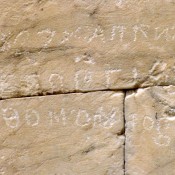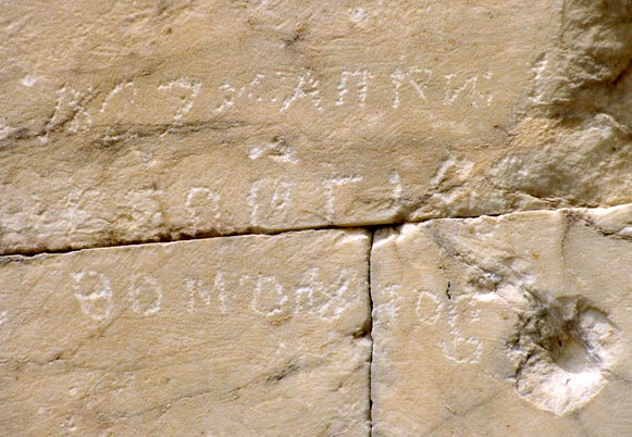 Τα αρχαιότερα χαράγματα χρονολογούνται στη ρωμαϊκή ή υστερορρωμαϊκή περίοδο, είναι πολύ λίγα και βρίσκονται σε στάθμες αντίστοιχες με εκείνες του αρχικού δαπέδου ή εδάφους μέσα και γύρω από το μνημείο. Όπως το όνομα «ΝΙΚΟΜΑΧΟΣ», γραμμένο πολύ προσεκτικά στη βόρεια πλευρά της κεντρικής διάβασης στο δυτικό άκρο ή το λάξευμα «ΔΕΣΠΟΙΝΑ/ΑΡΤΕΜΙΚΟΛΑΙΝΙ» στη βόρεια πλευρά του θυραίου τοίχου της βόρειας πτέρυγας, που αναφέρεται στην Άρτεμη, καθώς «Κολαινίς» ήταν το επίθετο που της απέδιδαν οι δημότες του Μυριννούντος, της σημερινής Μερέντας κοντά στο Μαρκόπουλο της Αττικής.