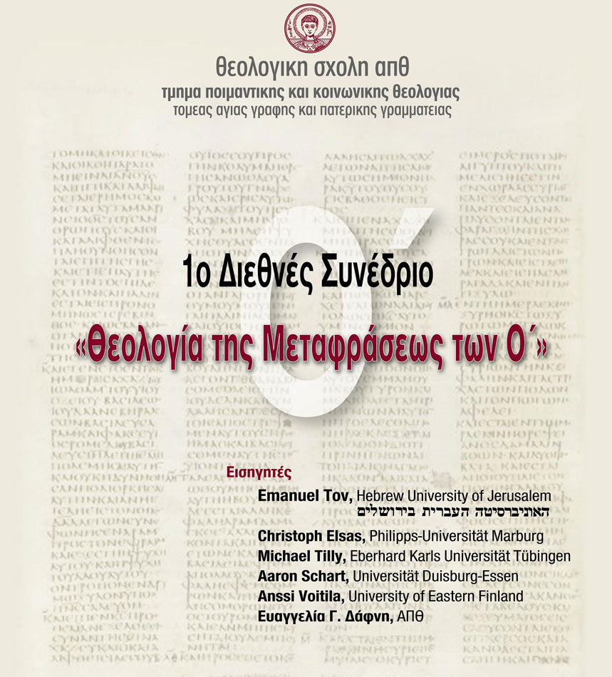 Το πρώτο Διεθνές Συνέδριο, με θέμα «Θεολογία της Μεταφράσεως των Εβδομήκοντα», διοργανώνει ο τομέας Αγίας Γραφής και Πατερικής Γραμματείας του Τμήματος Ποιμαντικής και Κοινωνικής Θεολογίας του ΑΠΘ την Πέμπτη 13 και την Παρασκευή 14 Μαρτίου 2014, στη Θεσσαλονίκη.