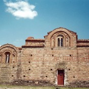 Παράλληλα, στην ανατολική πλευρά του νάρθηκα, σώζεται και η τοιχογραφία των δωρητών του ναού (σημ. 10). Στο κέντρο, δεσπόζει η Θεοτόκος ένθρονη βρεφοκρατούσα, πλαισιωμένη από δύο αγγέλους. Κάτω από το υποπόδιό της, σε μικρότερη κλίμακα, διακρίνονται κεφαλές αγίων, καθώς και δύο ζεύγη λαϊκών. Αποσπασματικά σωζόμενες επιγραφές, με λευκά γράμματα τοποθετημένα μέσα σε γαλάζιο βάθος, επάνω από κάθε ζευγάρι συμβάλλουν στην ταύτιση των μορφών. Αριστερά λοιπόν εικονίζεται ο πρωτοστράτορας Θεόδωρος, συνοδευόμενος από τη σύζυγό του Μαρία, ο οποίος κρατά στο αριστερό του χέρι ομοίωμα του ναού, με ψηλό τρούλο, και το προσφέρει στη Θεοτόκο. Αντίστοιχα δεξιά της Θεοτόκου, ο αδερφός του Ιωάννης Τζιμισκής, συνοδευόμενος επίσης από τη σύζυγό του Άννα. Οι μορφές είναι ενδεδυμένες με πολυτελή, όχι όμως βασιλικά, ενδύματα και αποδοσμένες με νατουραλιστική φυσικότητα, χωρίς σχηματική αυστηρότητα. Πιο συγκεκριμένα, οι αντρικές μορφές φορούν ποδήρεις χιτώνες με χρυσοποίκιλτα σιρίτια, ενώ οι γυναικείες μακριά κόκκινα πανωφόρια με διακοσμημένες άκρες και λευκά μαντήλια στις κεφαλές με χρωματιστές ταινίες στο μέτωπο. Επιπλέον, οι δύο αντρικές μορφές αποδίδονται πωγωνοφόρες, με μακριά βοστρυχωτή κόμη. Αντίθετα, οι δύο γυναικείες είναι ιδιαιτέρως φθαρμένες και δεν διακρίνονται τα επιμέρους χαρακτηριστικά τους. Συνδυάζοντας τα στοιχεία της κτητορικής επιγραφής και τα αντίστοιχα της τοιχογραφίας των δωρητών, προκύπτει ότι το καθολικό ιστορήθηκε διά συνδρομής του πρωτοστράτορα Θεοδώρου Τζιμισκή και του αδελφού του Ιωάννη κατά τη θ΄ Ινδικτιώνα της βασιλείας του δεσπότη Νικηφόρου και της συζύγου του Άννας Παλαιολογίνας. Επομένως, η ίδρυσή του θα πρέπει να τοποθετηθεί λίγα χρόνια νωρίτερα.