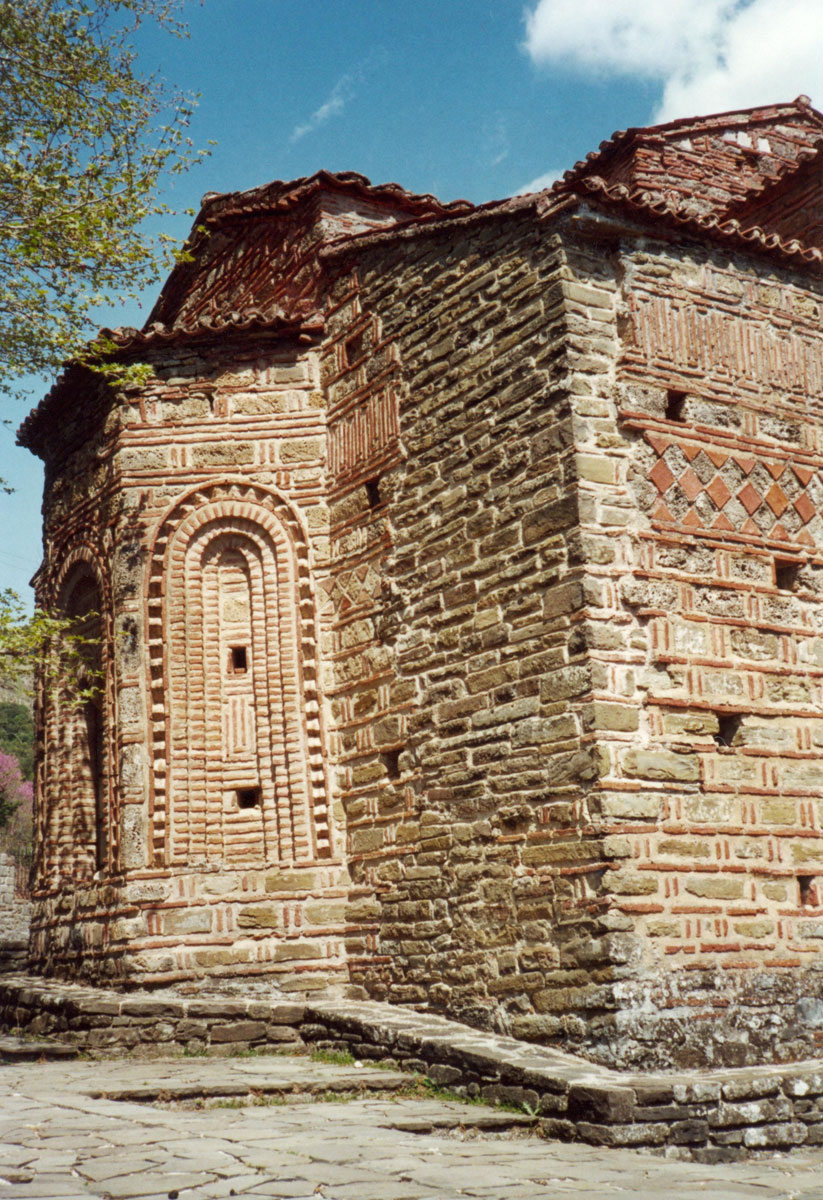 Αναφορικά με το μνημείο συνολικά, μια ιδιαίτερη άποψη (σημ. 35) είναι αυτή του καθηγητή H. Hallensleben. Μελετώντας την Κόκκινη Εκκλησιά και διαπιστώνοντας τις ομοιότητες, ως προς τον αρχιτεκτονικό τύπο, τον τρόπο κατασκευής αλλά και διακόσμησης, με τον Άγιο Κλήμεντα της Αχρίδας, υποστήριξε ότι τα δυο μνημεία κατασκευάστηκαν από το ίδιο συνεργείο μαστόρων, με την Κόκκινη Εκκλησιά μάλιστα να προηγείται και να αποτελεί το πρότυπο και για τον Άγιο Κλήμεντα.