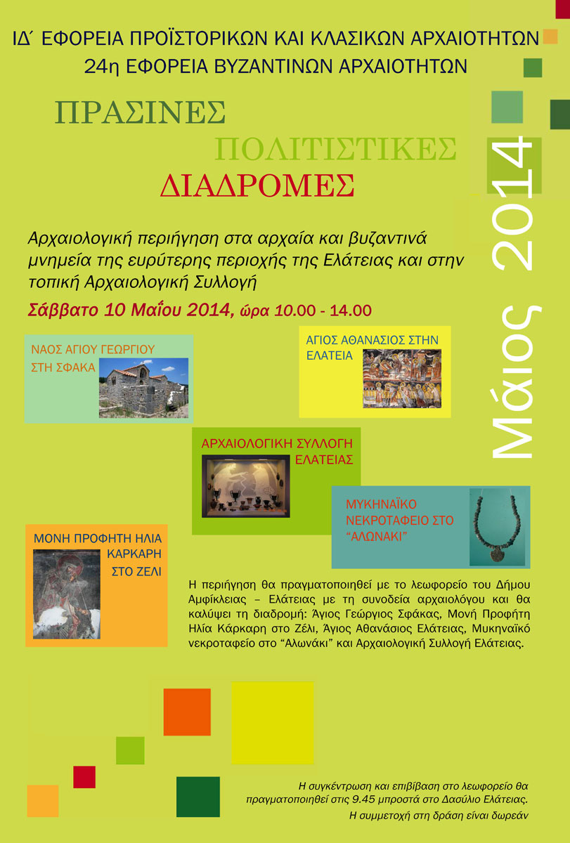 Αρχαιολογική περιήγηση στα αρχαία και βυζαντινά μνημεία της ευρύτερης περιοχής της Ελάτειας και στην τοπική Αρχαιολογική Συλλογή διοργανώνουν η ΙΔ’ Εφορεία Προϊστορικών και Κλασικών Αρχαιοτήτων και η 24η Εφορεία Βυζαντινών Αρχαιοτήτων, συμμετέχοντας στην πανελλαδική δράση του Υπουργείου Πολιτισμού και Αθλητισμού με τίτλο «Πράσινες Πολιτιστικές Διαδρομές», το Σάββατο 10 Μαΐου 2014, ώρα 10.00-14.00.