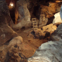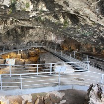 Από την άλλη πλευρά, ανατολικά της γέφυρας, συνεχίζει η αρχαιολόγος, βλέπει ο επισκέπτης τα τρία σκάμματα, δίπλα ακριβώς στα ανατολικά βραχώδη τοιχώματα του σπηλαίου, όπου, διευκρινίζει, η ανασκαφή έχει φτάσει στο φυσικό ασβεστολιθικό υπόβαθρο και όπου έχουν βρεθεί σε πολύ καλή κατάσταση διατήρησης οστά Μέσης Παλαιολιθικής εποχής που ανήκουν σε σπηλαία άρκτο αλλά και σε ύαινα, κόκκινο ελάφι, αιγοειδή, λύκο και άλλα μικρότερα είδη ζώων. Μετά τη γέφυρα, μέσω του διαδρόμου που ολοκληρώνει τη διαδρομή, διακρίνονται οι εναλλαγές του κλίματος στη διάρκεια του Πλειστοκαίνου, σημαίνεται ο χώρος εύρεσης της μεσολιθικής ταφής, αλλά ο επισκέπτης βλέπει στη θέση εύρεσής της καλυμμένη με πλέξιγκλας και άλλη μεσολιθική ταφή που βρέθηκε με την ευκαιρία των έργων ανάδειξης στο σπήλαιο.