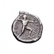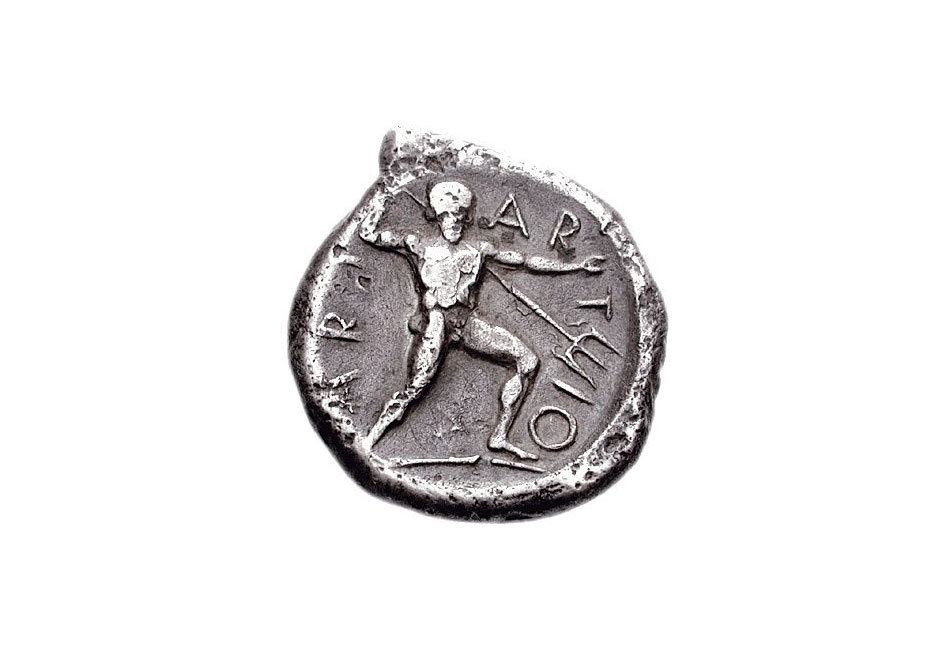 α) Η παράσταση του Ποσειδώνα σε νόμισμα, αντίγραφο του αγάλματος