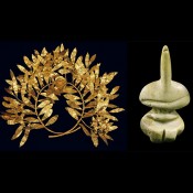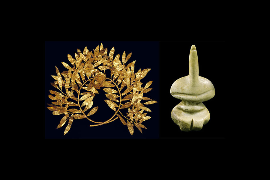 Επίσης, θα παρουσιαστούν μεταξύ άλλων χρυσό στεφάνι από φύλλα μυρτιάς με ένα πολύφυλλο άνθος στο κέντρο (4ος-3ος αι. π.Χ.), τμήμα χρυσού περιδεραίου με κυλινδρικές ψήφους και κρεμαστά εξαρτήματα σε σχήμα κλειστού άνθους (4ος αι. π.Χ.), πήλινο μινωικό ειδώλιο γυναικείας μορφής (1450-1375 π.Χ.) και αττικός ερυθρόμορφος καλυκωτός κρατήρας με παράσταση του Διονύσου, της Αριάδνης και του Έρωτα, που αποδίδεται στον Ζωγράφο της Βιέννης (400-390 π.Χ.).