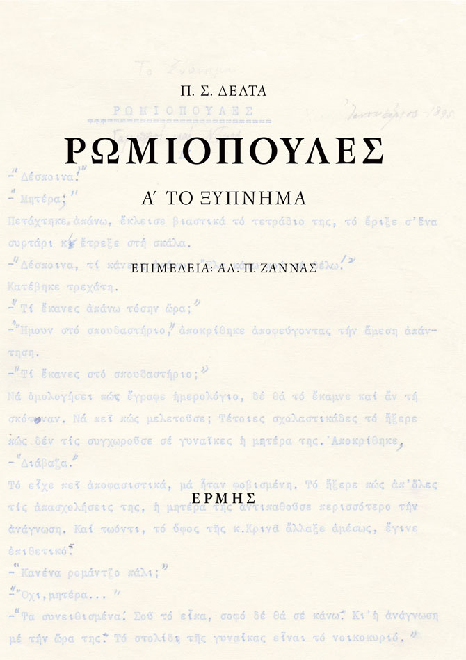 Οι Ρωμιοπούλες, που κυκλοφορούν για πρώτη φορά από τις Εκδόσεις Ερμής, είναι το μόνο μυθιστόρημα της Π.Σ. Δέλτα που δεν απευθύνεται σε παιδιά. Η δημοσίευσή του, 75 χρόνια μετά το τέλος της συγγραφής του, σηματοδοτεί και το τέλος της παρουσίασης των κειμένων της Δέλτα που βρέθηκαν στο αρχείο της και αποτελούν αυτοτελή αυτοβιογραφικά κείμενα.