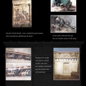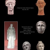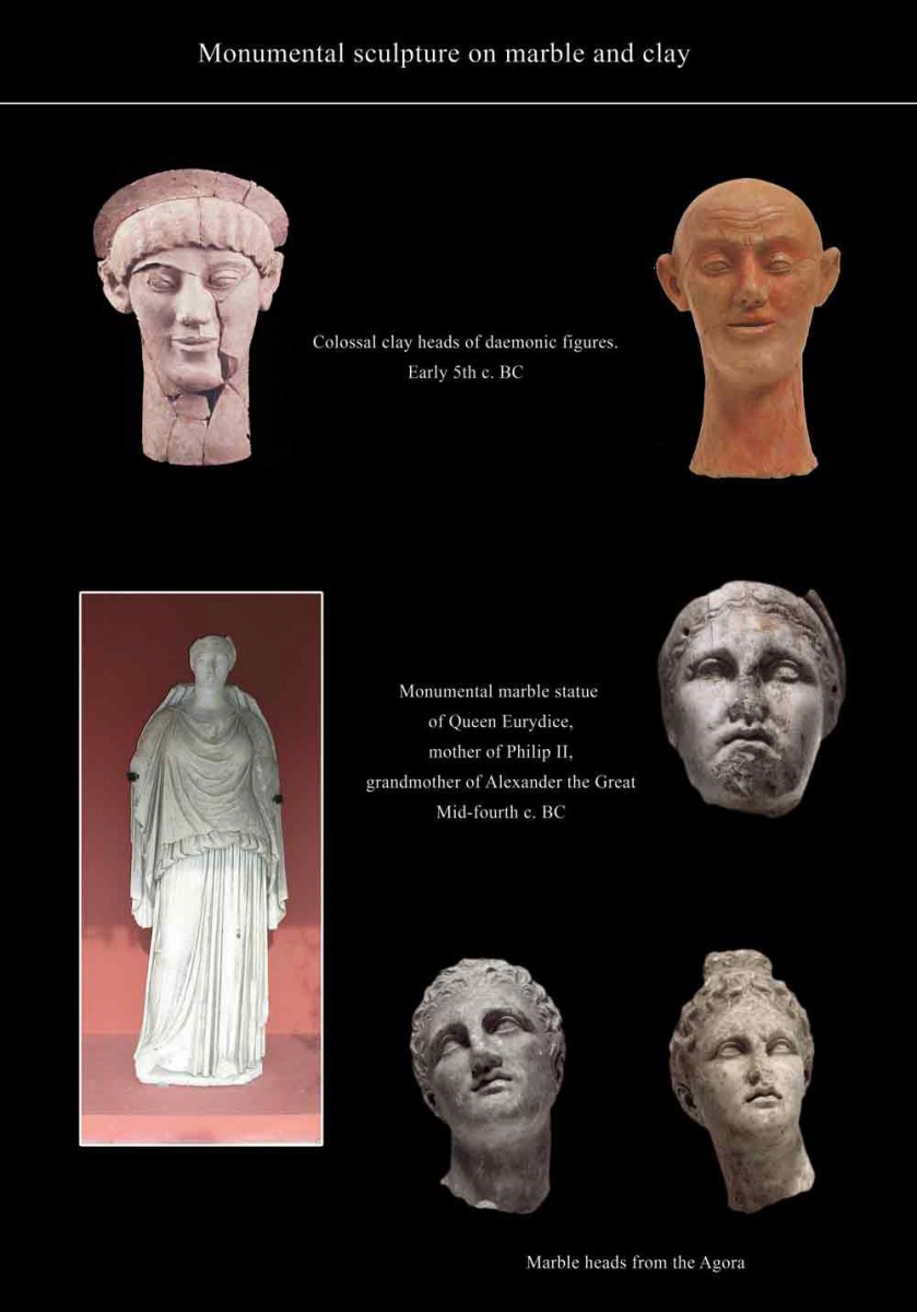 Η εικαστική περιήγηση στο ανάκτορο, το θέατρο, την αγορά και το νεκροταφείο των Αιγών συνοδεύεται με απεικονίσεις έργων γλυπτικής, μικρογλυπτικής, επιτύμβιων στηλών, κοσμημάτων, όπλων και τεφροδόχων αγγείων, που αντανακλούν τη μέγιστη σημασία του αρχαιολογικού χώρου για την ιστορία και τον πολιτισμό των αρχαίων Μακεδόνων και την καίρια συμβολή του ΑΠΘ στην ανασκαφή του.
