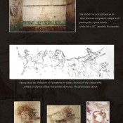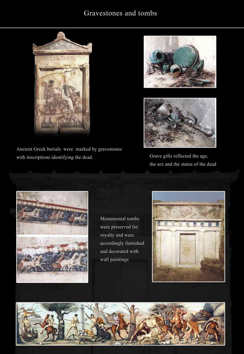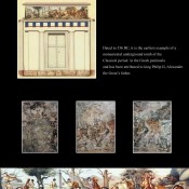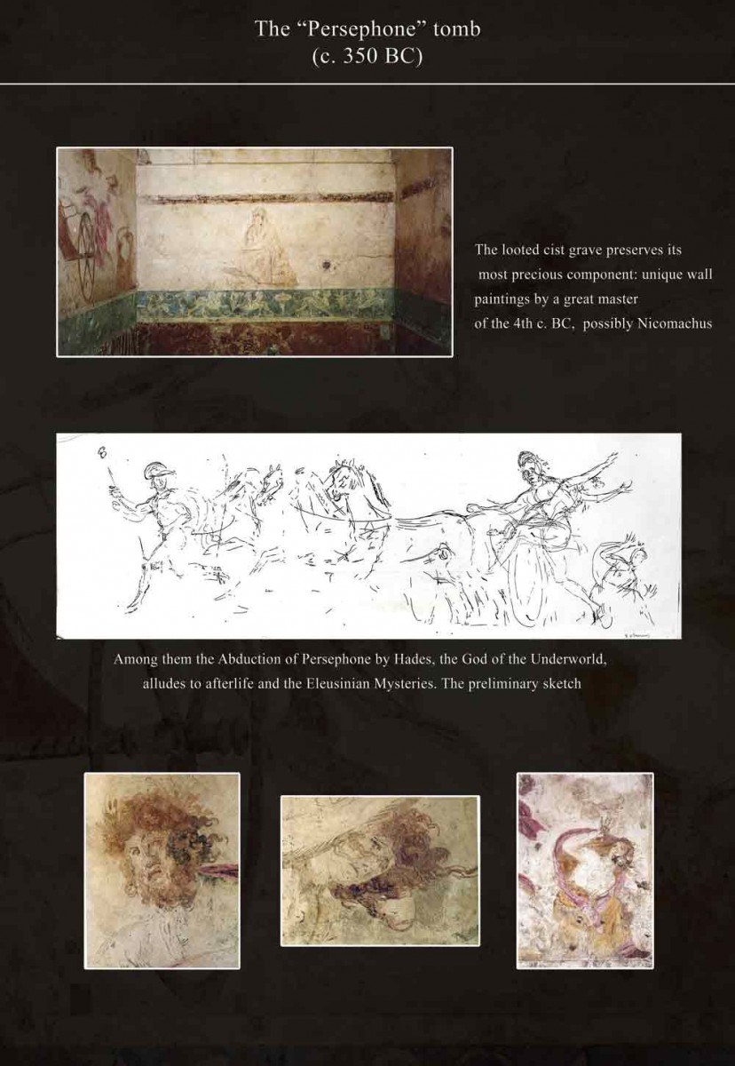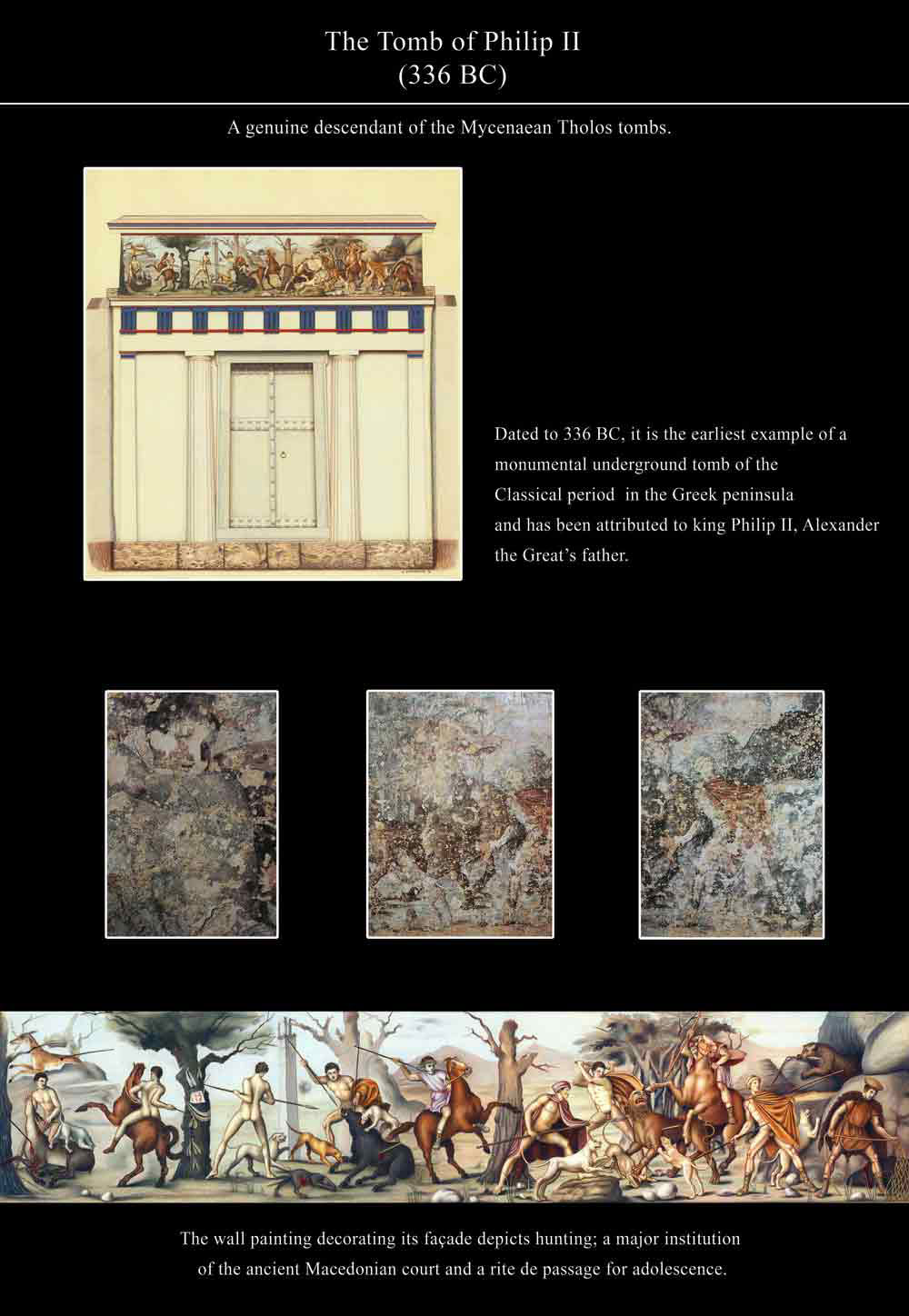 Η έκθεση περιλαμβάνει 11 πάνελς (0,70×1 μ.) με φωτογραφίες μνημείων και ευρημάτων από τον αρχαιολογικό χώρο της Βεργίνας. Ξεχωριστή θέση, ωστόσο, ανάμεσα στα εκθέματα κατέχουν οι αναπαραγωγές, σε φυσικό μέγεθος, των δύο μνημειακών τοιχογραφιών από τους βασιλικούς τάφους της Μεγάλης Τούμπας: της ζωφόρου με το κυνήγι λιονταριού από τον τάφο του Φιλίππου Β’, ψηφιακά επεξεργασμένης από τον Διευθυντή του Μουσείου Liebieghaus καθ. V. Brinkmann, και της Aρπαγής της Περσεφόνης από τον Άδη που κοσμεί το εσωτερικό του λεγόμενου Τάφου της Περσεφόνης, σε ψηφιοποιημένο αντίγραφο του αρχαιολόγου Γ. Μιλτσακάκη.