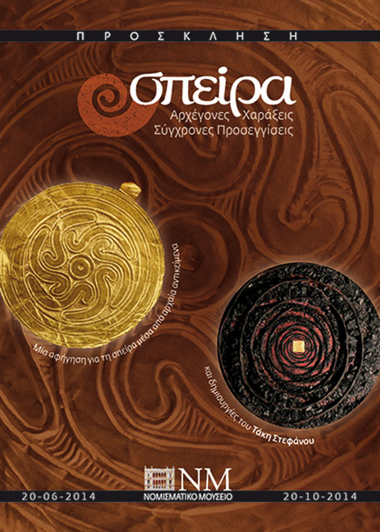 Περιοδική έκθεση με τίτλο Σπείρα. Αρχέγονες χαράξεις – σύγχρονες προσεγγίσεις, με μουσειακά αντικείμενα και δημιουργίες του εικαστικού Τάκη Στεφάνου θα εγκαινιαστεί την Παρασκευή 20 Ιουνίου 2014, και ώρα 20.00, στο Νομισματικό Μουσείο.