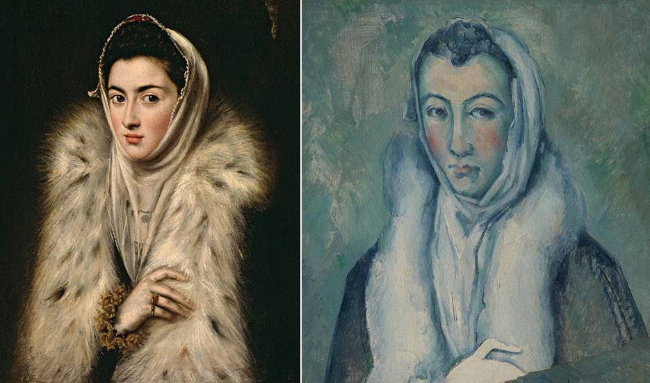 Στο βάθος πίσω του, τον κοιτούν με διαπεραστικό βλέμμα οι δυο «Γυναίκες με την Ερμίνα»: η πρώτη φιλοτεχνήθηκε μεταξύ 1577-1579 από τον Ελ Γκρέκο ενώ η άλλη, με τις παστέλ γαλάζιες αποχρώσεις, γεννήθηκε από το πινέλο του Πολ Σεζάν τρεις αιώνες αργότερα (1885-6) αλλά ο τίτλος της παραπέμπει απευθείας στον πίνακα από τον οποίο εμπνεύστηκε ο Γάλλος ζωγράφος.