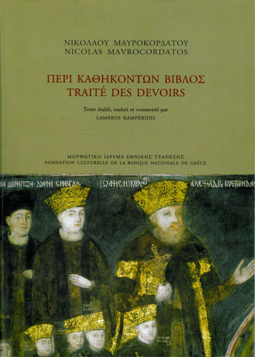 Νικόλαος Μαυροκορδάτος, Περί καθηκόντων βίβλος – Traité des devoirs, ελληνικό κείμενο σε μετάφραση και σχολιασμό στα γαλλικά από τον Λάμπρο Καμπερίδη, Πρόλογος: Jacques Bouchard, MIET, Αθήνα 2014, 395 σελ.